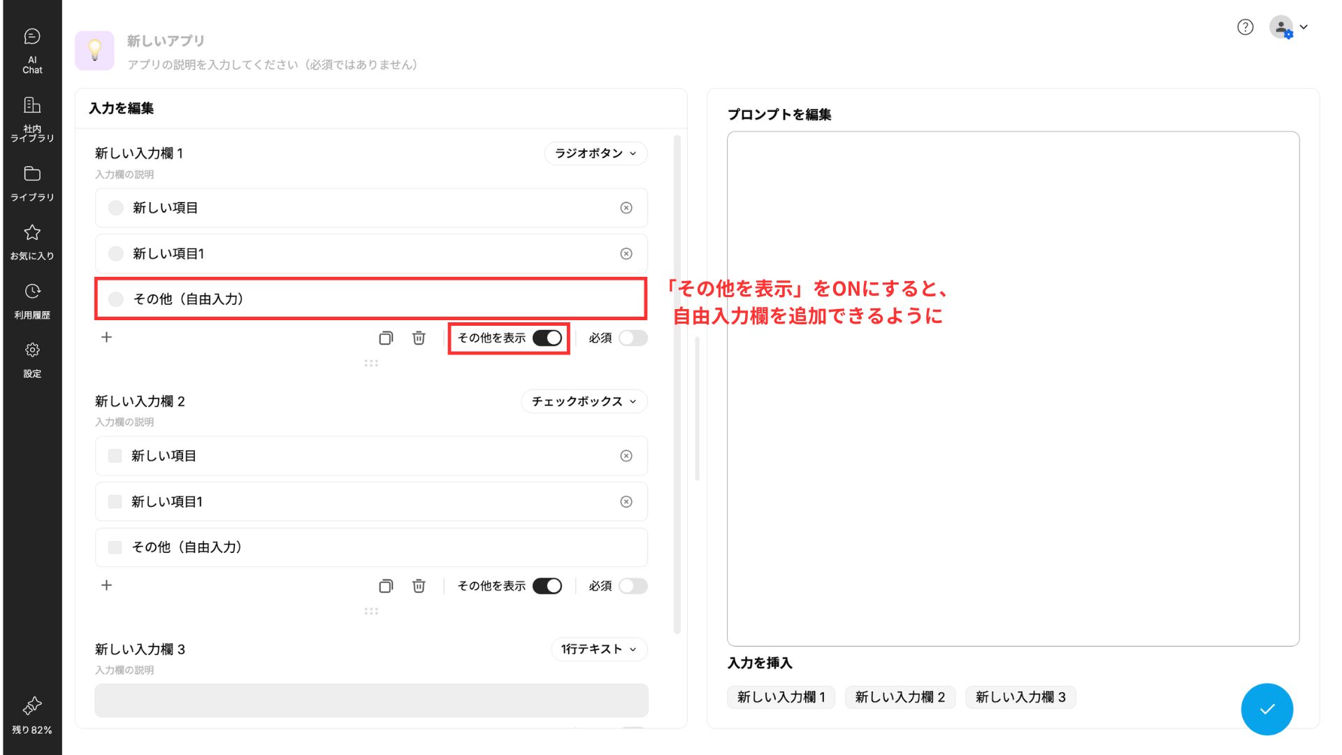 2026年3月24日、プロンプトアプリ/エージェントアプリ作成画面のラジオボタンとチェックボックスの入力フォームにて、自由記述欄を追加できるようになりました。