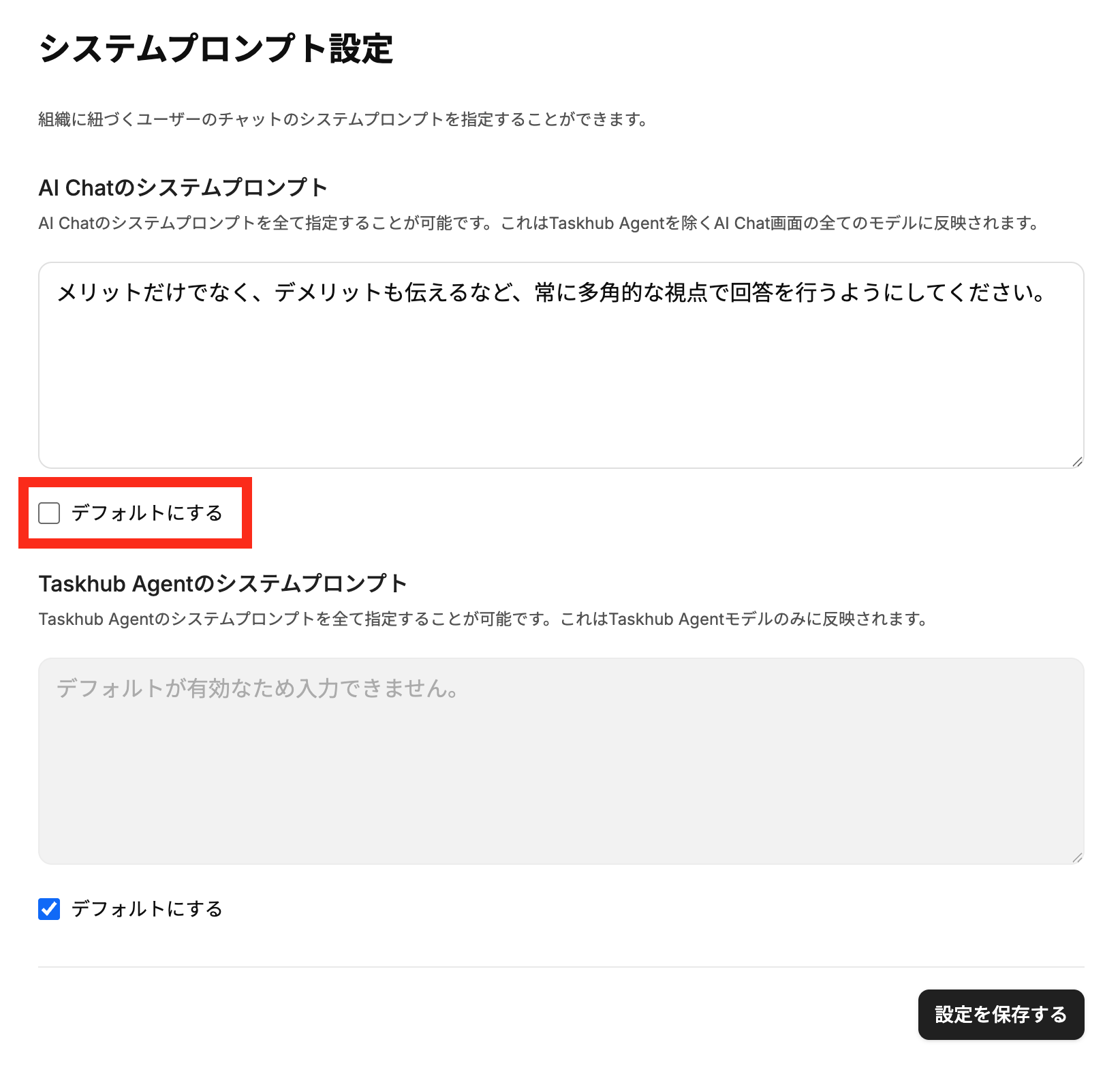 下記画像のように「デフォルトにする」というボタンのチェックを外すと、システムプロンプトを編集することができます。(通常はTaskhub共通のシステムプロンプトが設定されています。)