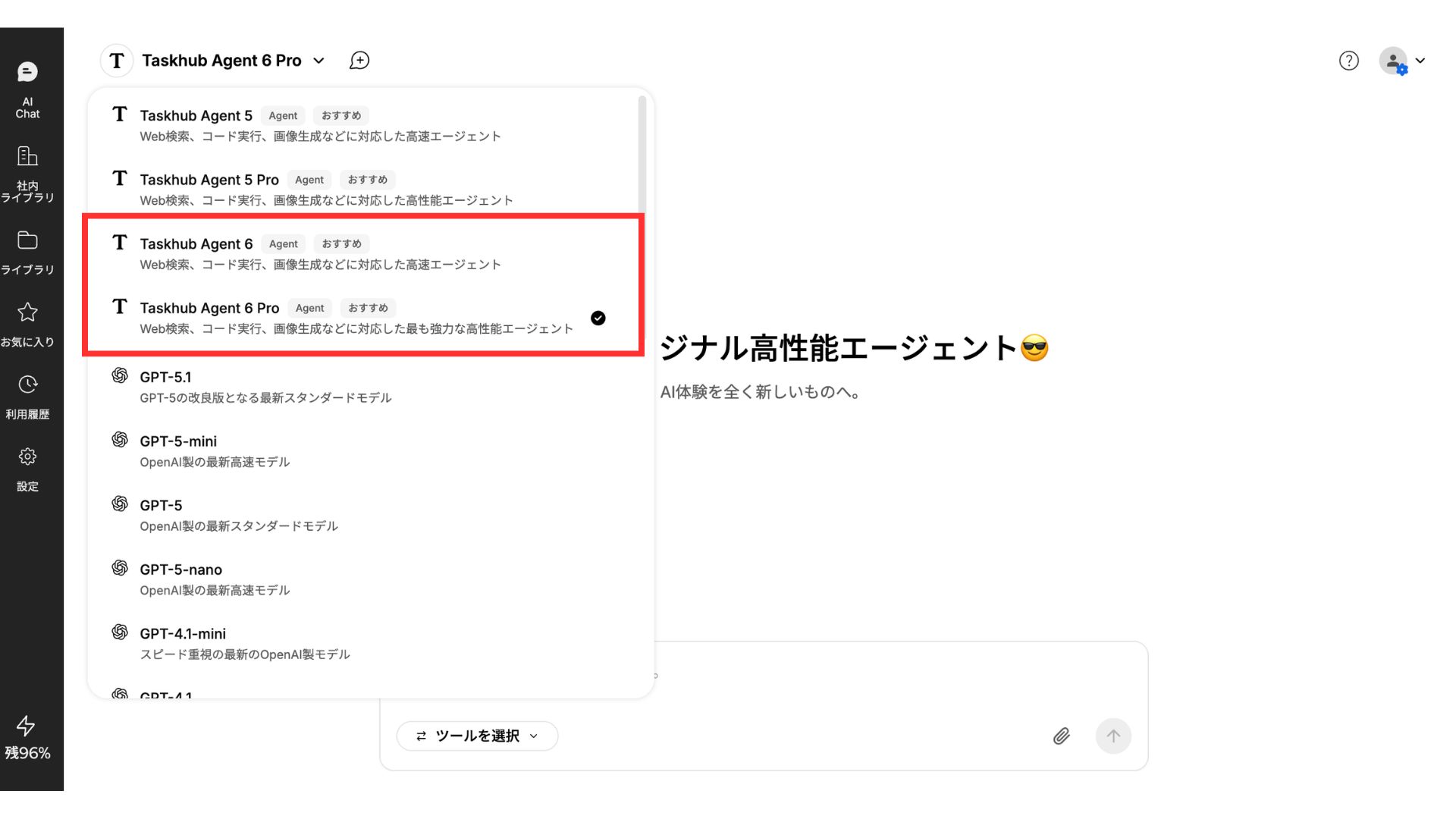 Taskhub Agent 6はGemini 3.0 Flash、Taskhub Agent 6 ProはGemini 3.0 Thinking highをベースとしています。