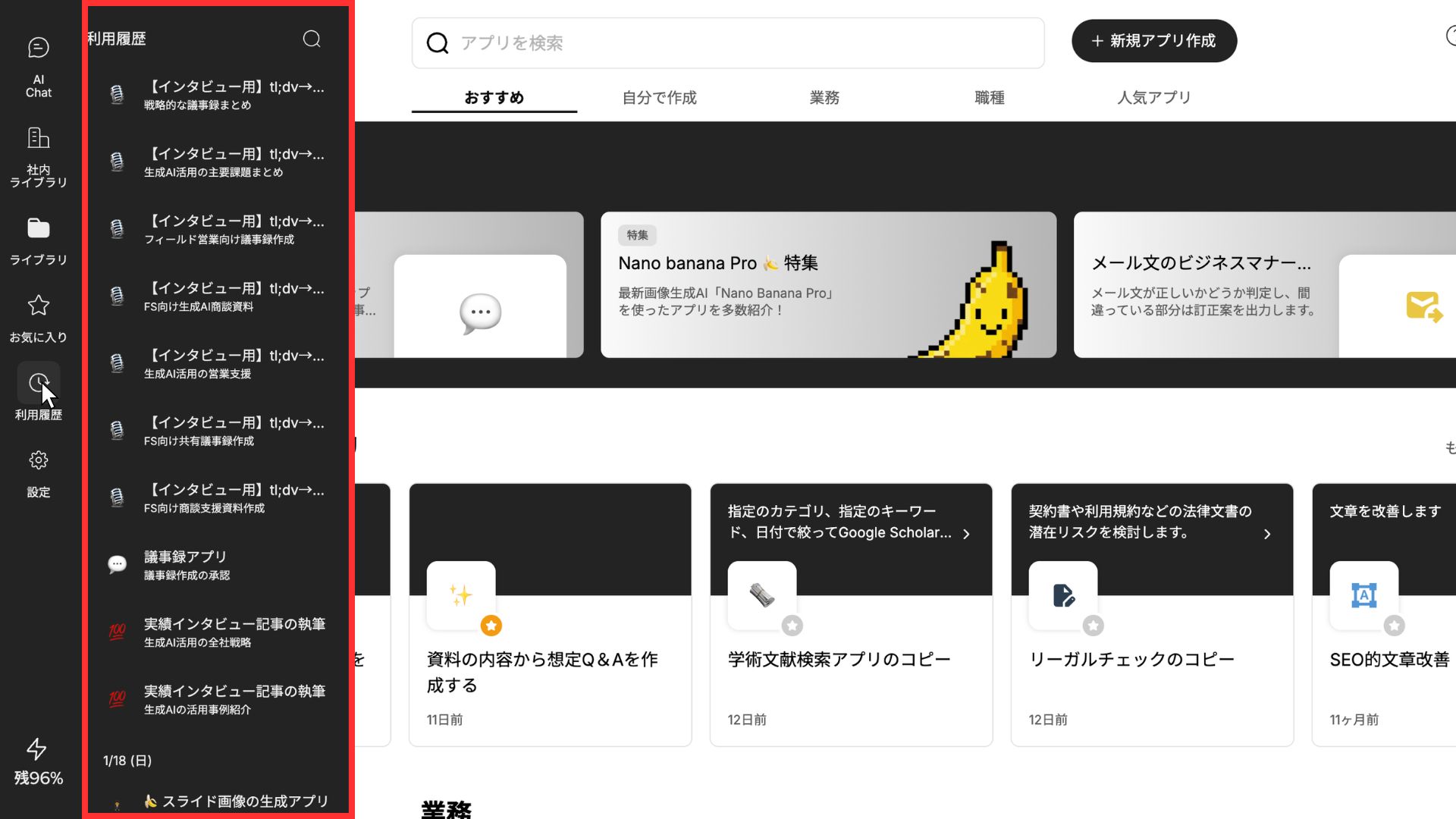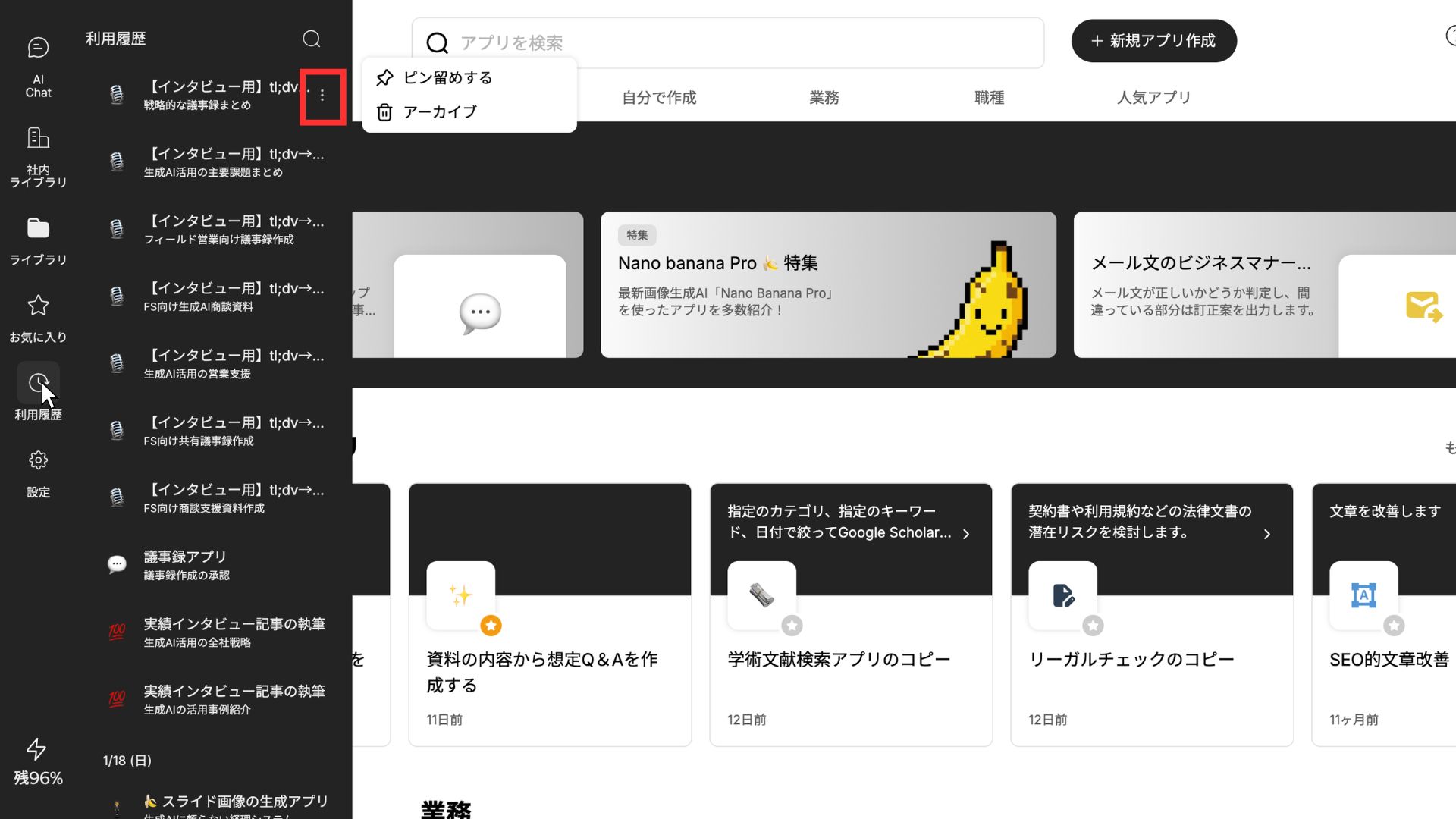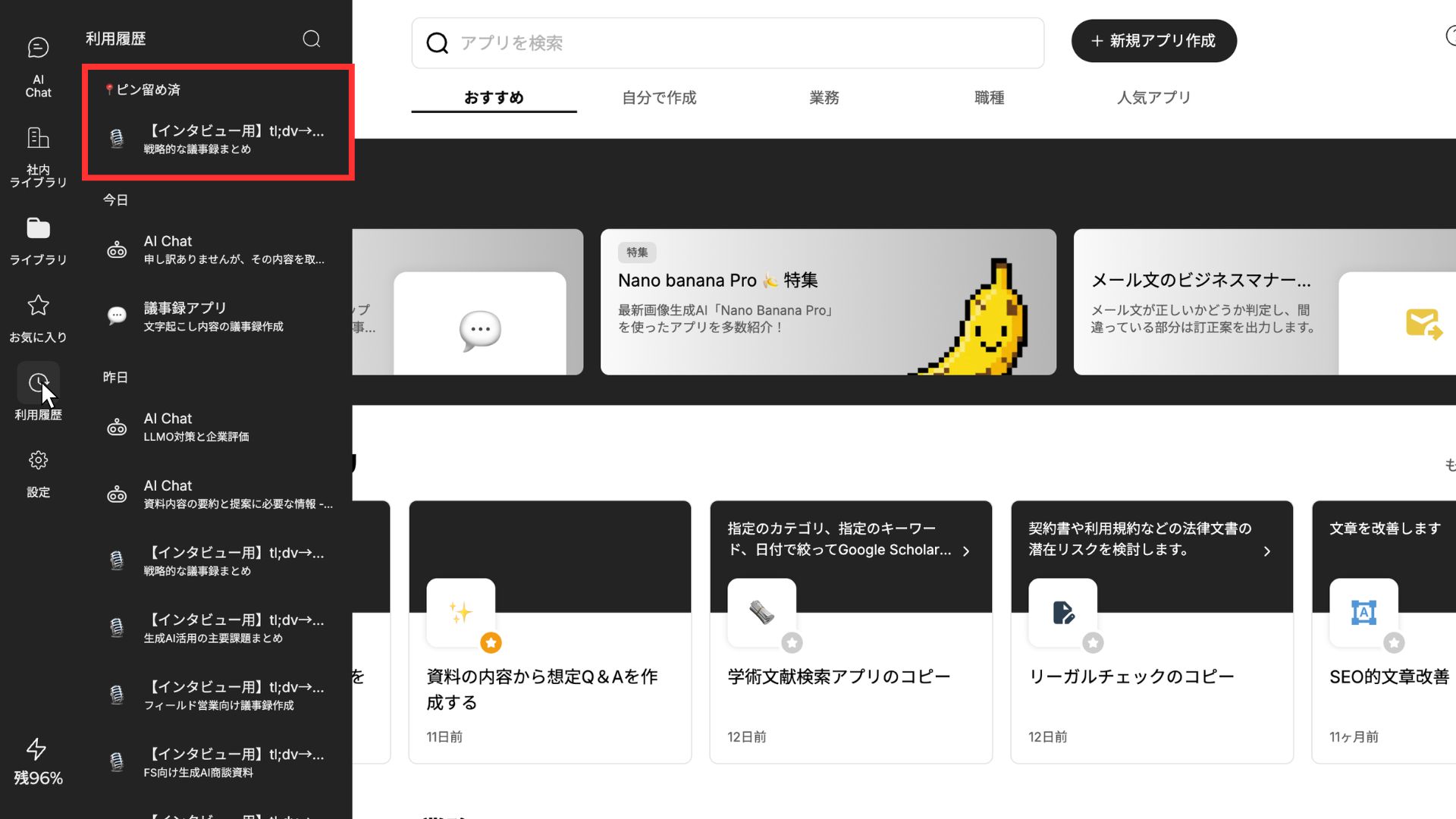 2026年1月19日、Taskhubの利用履歴にて、過去のアプリ実行履歴をピン留めできるようになりました。