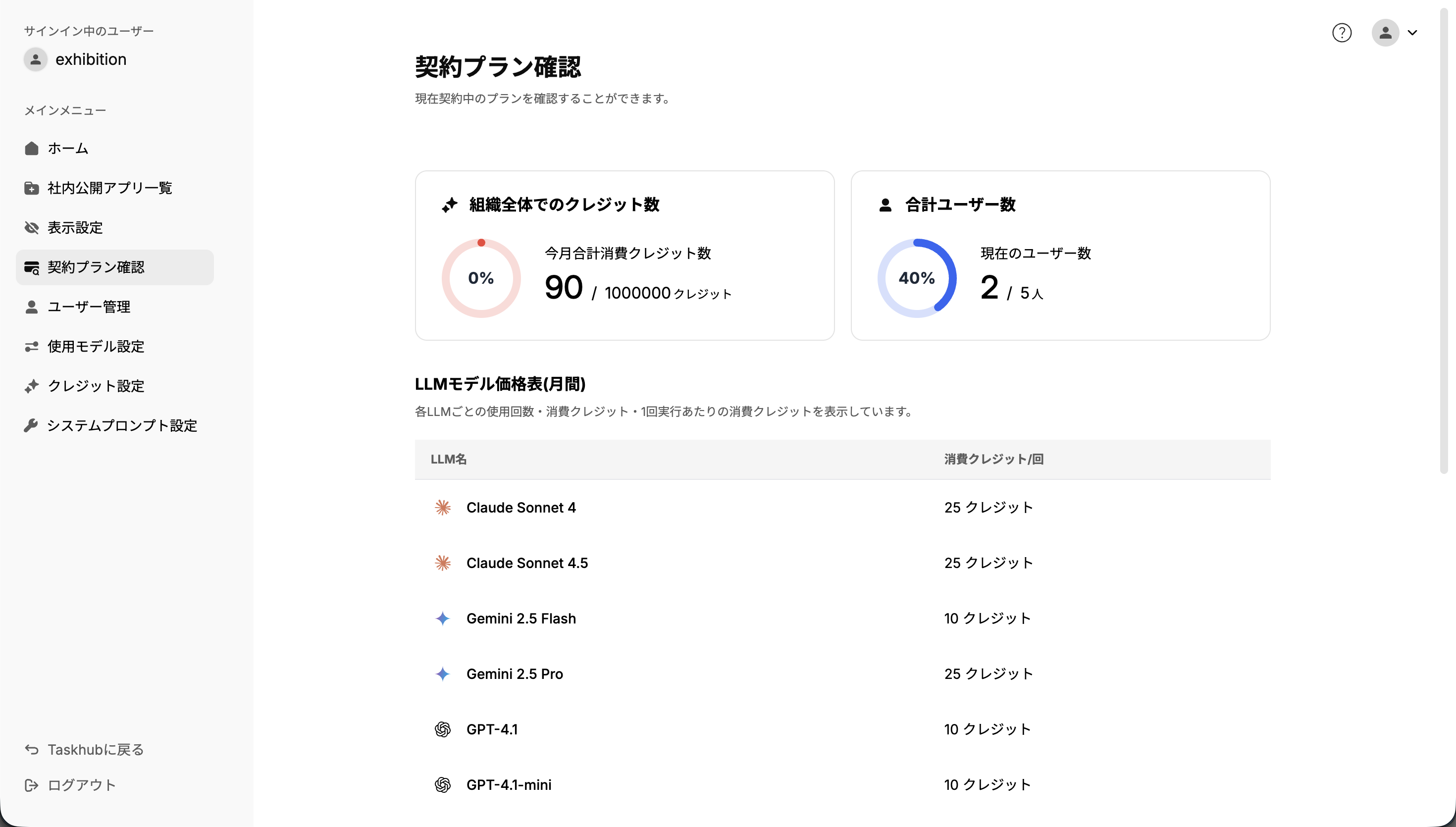 またページ下部では、現在Taskhubで提供されている全モデルと、その消費クレジット数を確認することができます。