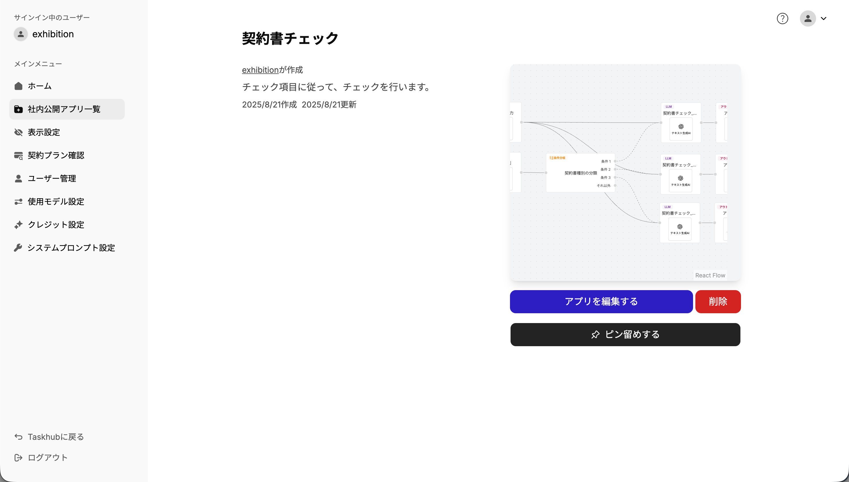 組織内ユーザーが作成し、公開されているアプリが一覧表示されます。この一覧からアプリをクリックすると、アプリの詳細を閲覧することが可能です。