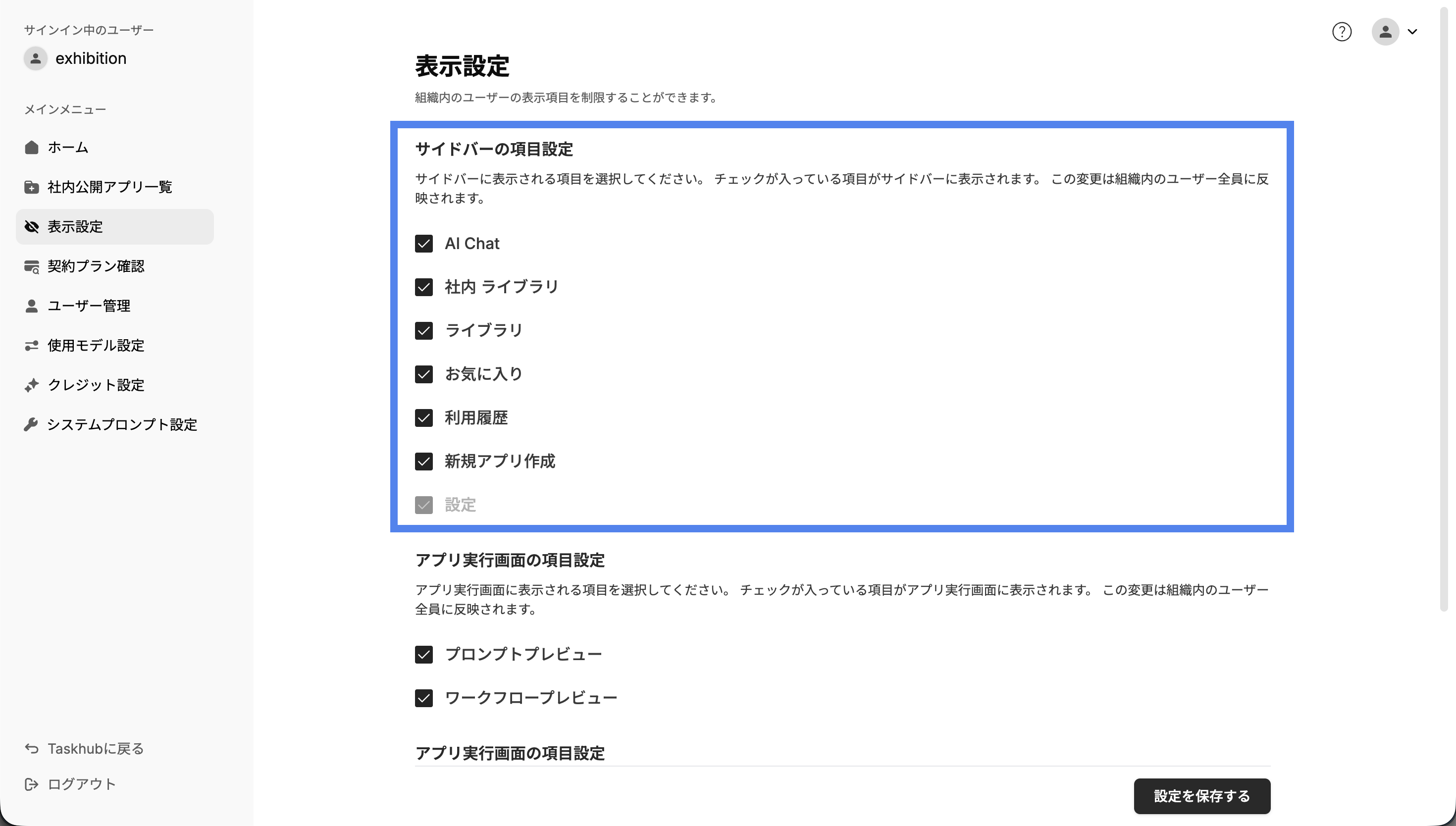 ユーザー画面から非表示にしたい項目がある場合は、チェックボックスからチェックを外してください。