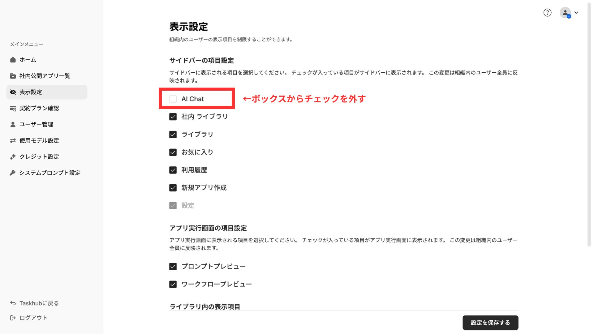 管理者画面の表示設定から「AIチャット」を非表示に変更したため、