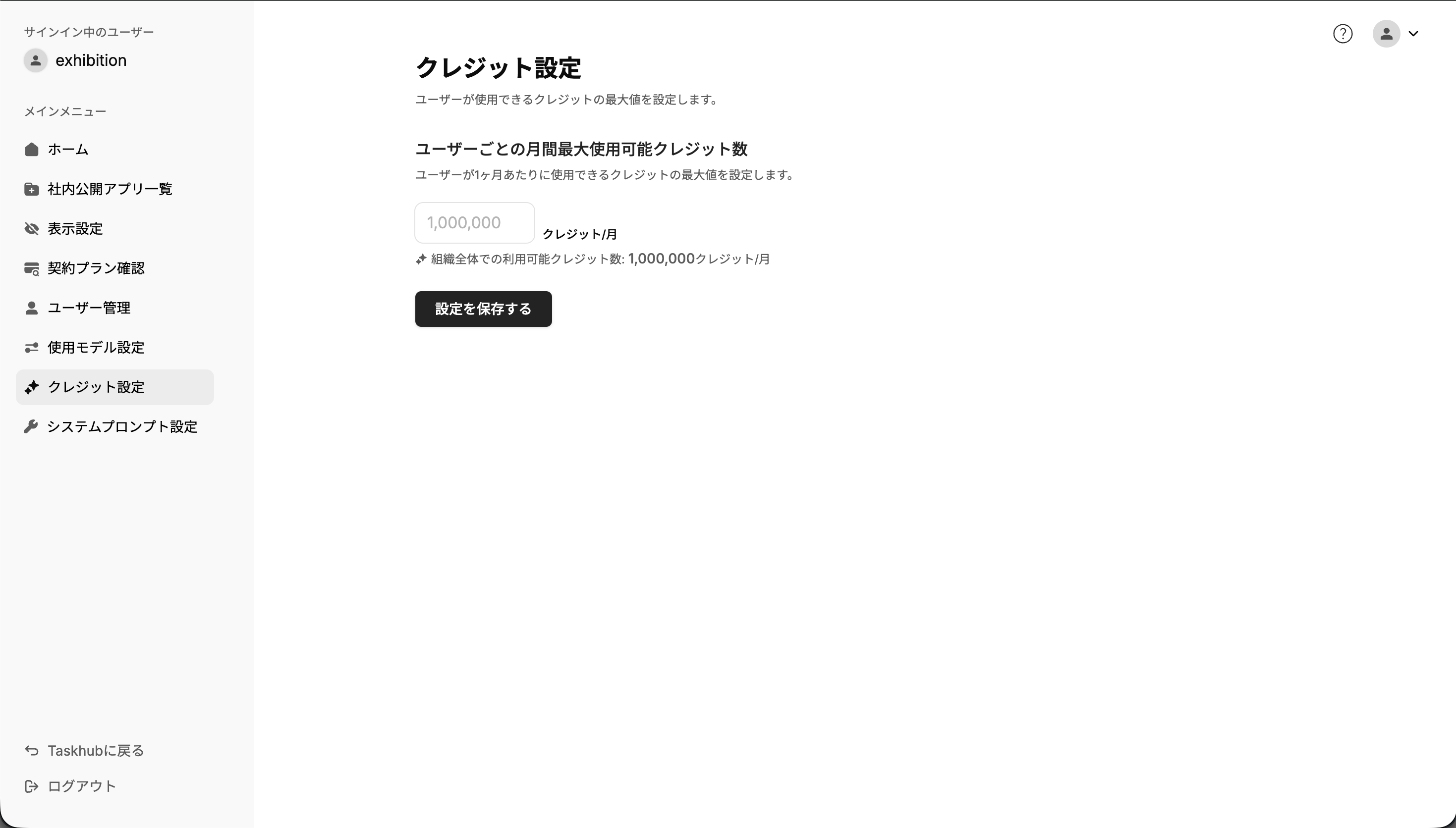 クレジット設定では、組織内のユーザーが1ヶ月につかえるクレジットの上限数を設定できます。