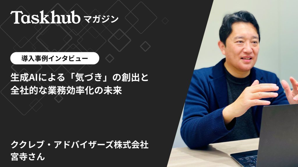 不動産にテクノロジーを掛け合わせ、新たなソリューションを提供するククレブ・アドバイザーズ株式会社。2019年の設立からわずか5年後の2024年11月に東証グロース市場への上場を果たし、少数精鋭ながらも … 続きを読む 生成AIによる「気づき」の創出と全社的な業務効率化の未来