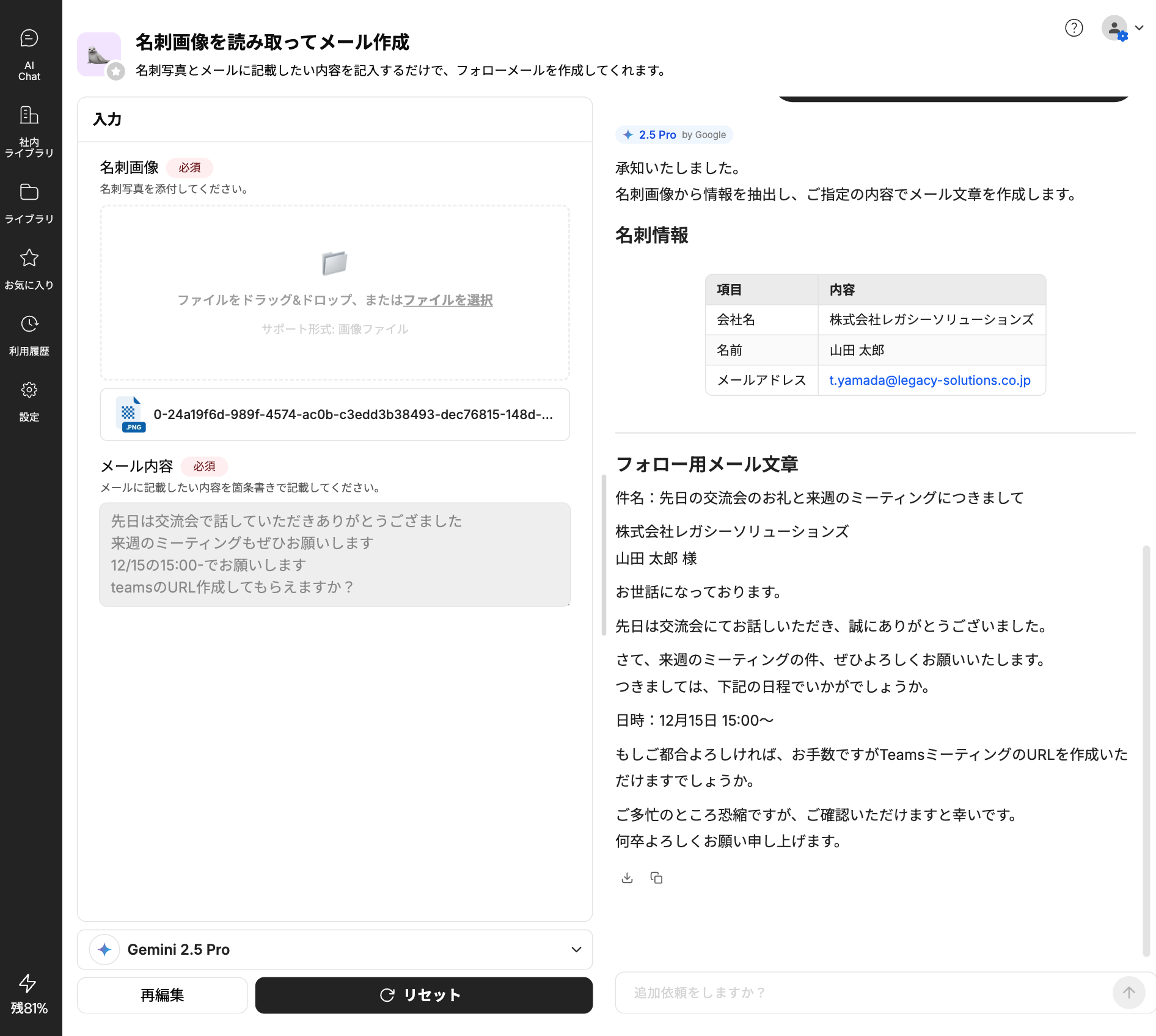 入力して数秒待つと、AIが名刺の会社名や氏名を自動で読み取り、丁寧なフォローメールを即座に作成してくれます。