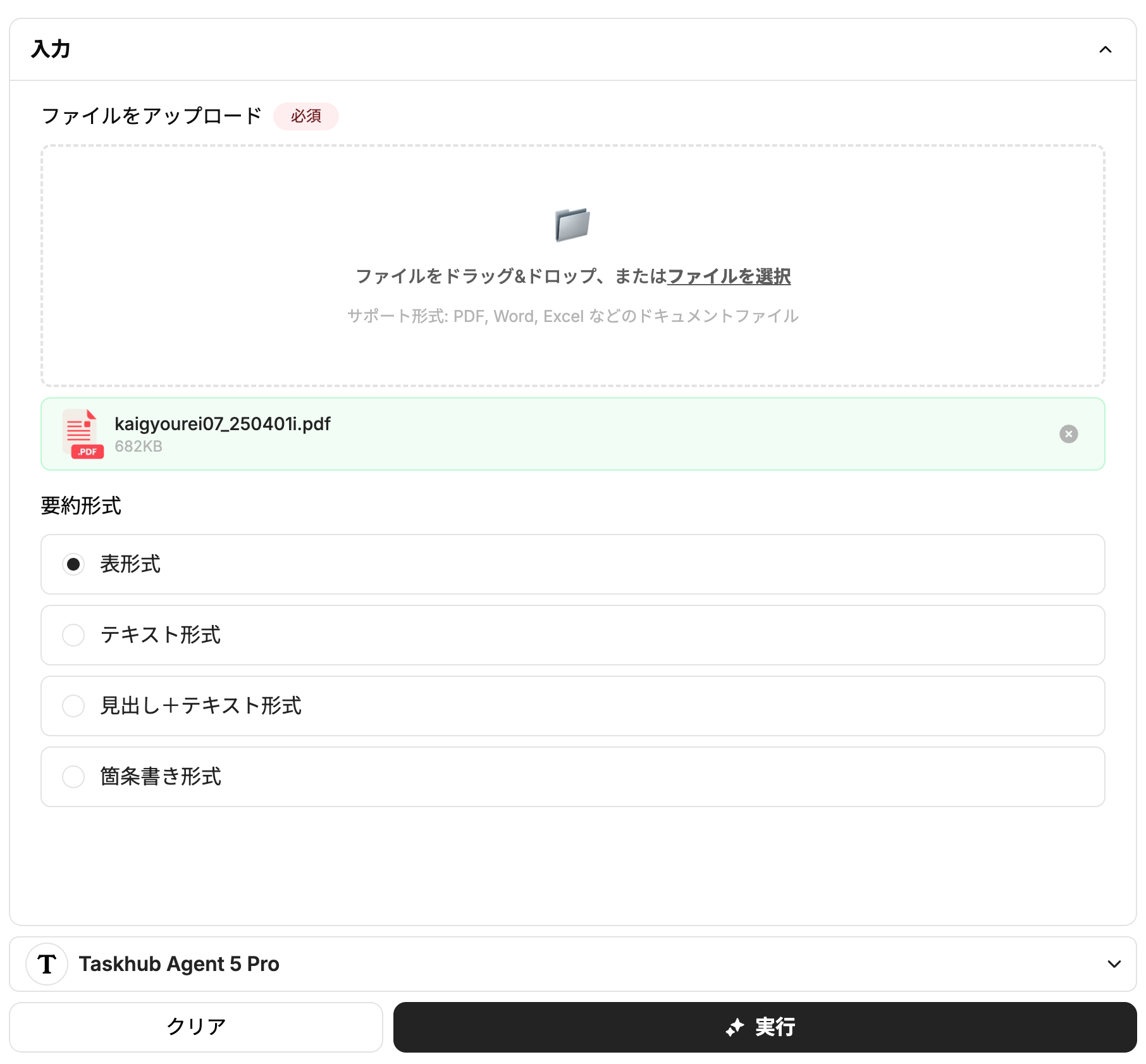 Taskhubの画面で、要約したいPDFやWordなどのファイルをアップロードします。次に、「表形式」や「箇条書き形式」など、出力したい要約の形式を選択します。