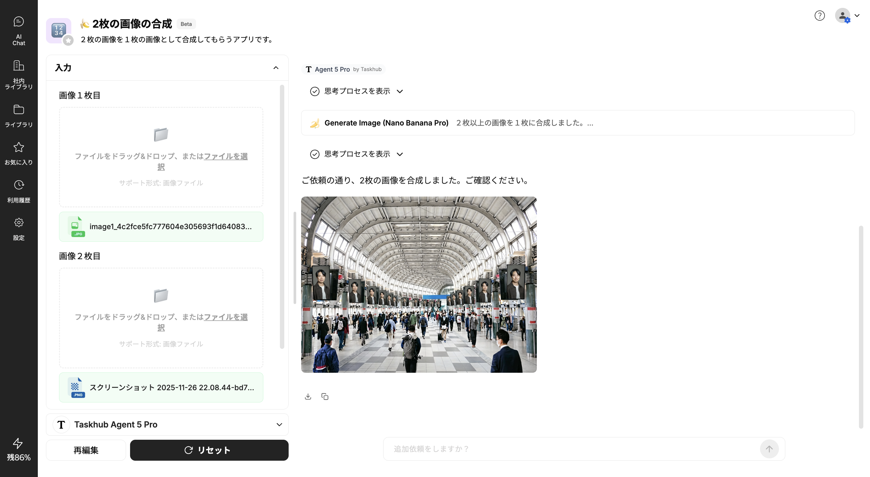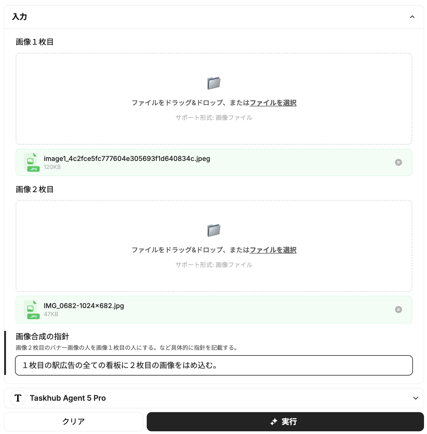 Taskhubの画面で、合成したい2枚の画像をアップロードし、「1枚目の駅広告の全ての看板に2枚目の画像をはめ込む」といった自然言語での指示を入力します。