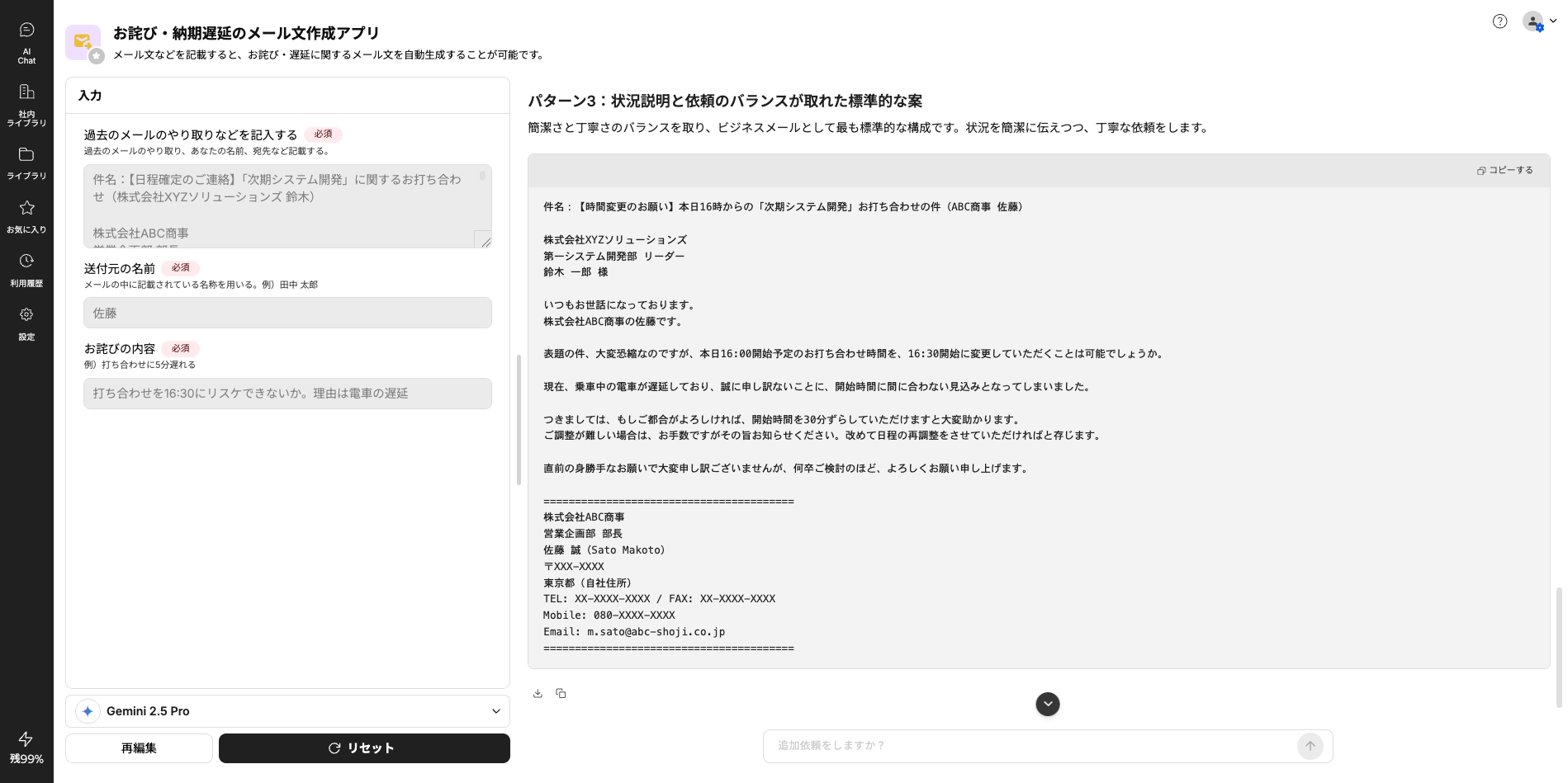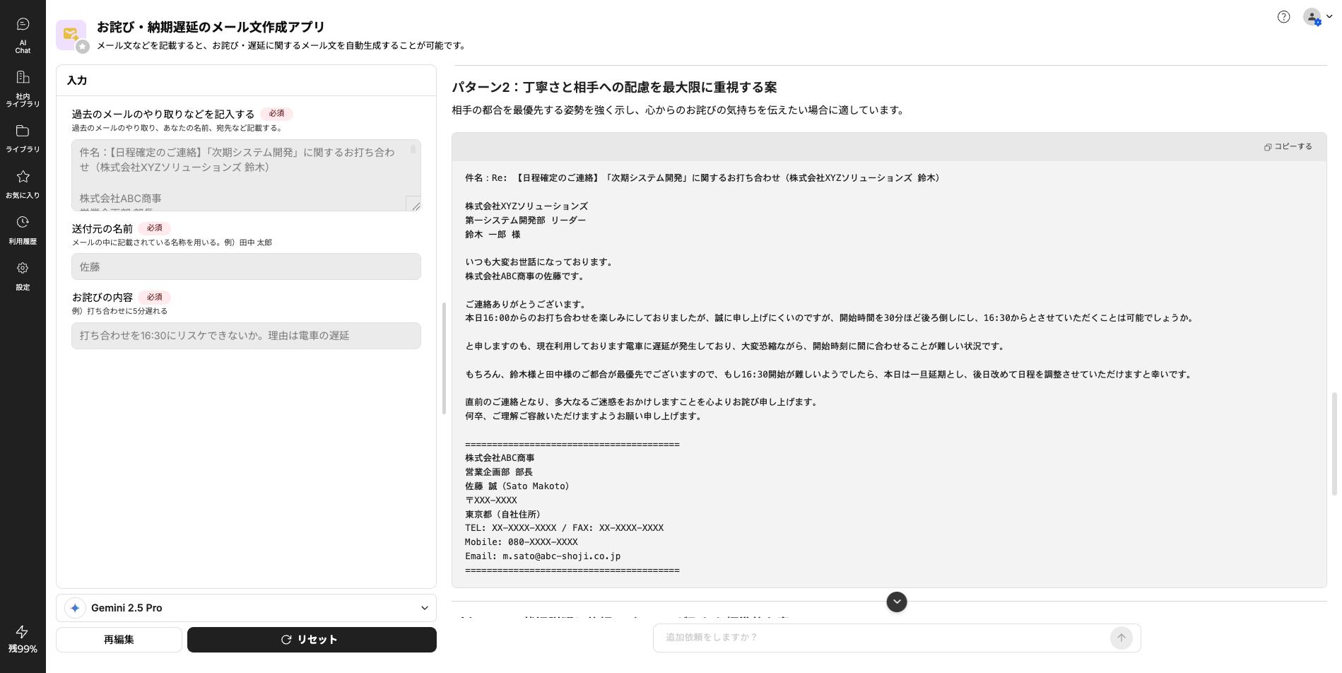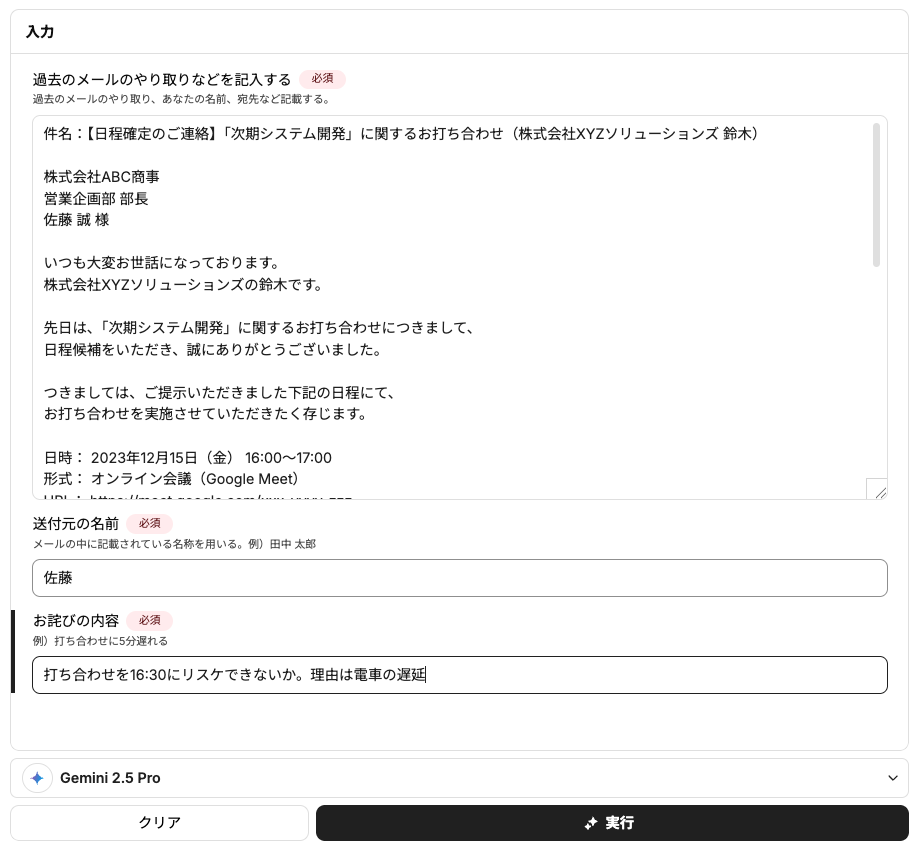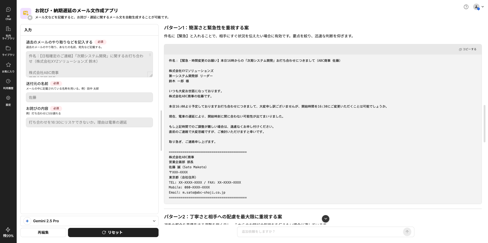 ✨ 要点入力だけでメールが完成: 「電車遅延」「30分リスケしたい」など要点を入力するだけで、AIが状況に応じた丁寧な謝罪メールを複数パターン生成。焦る必要がなくなります。