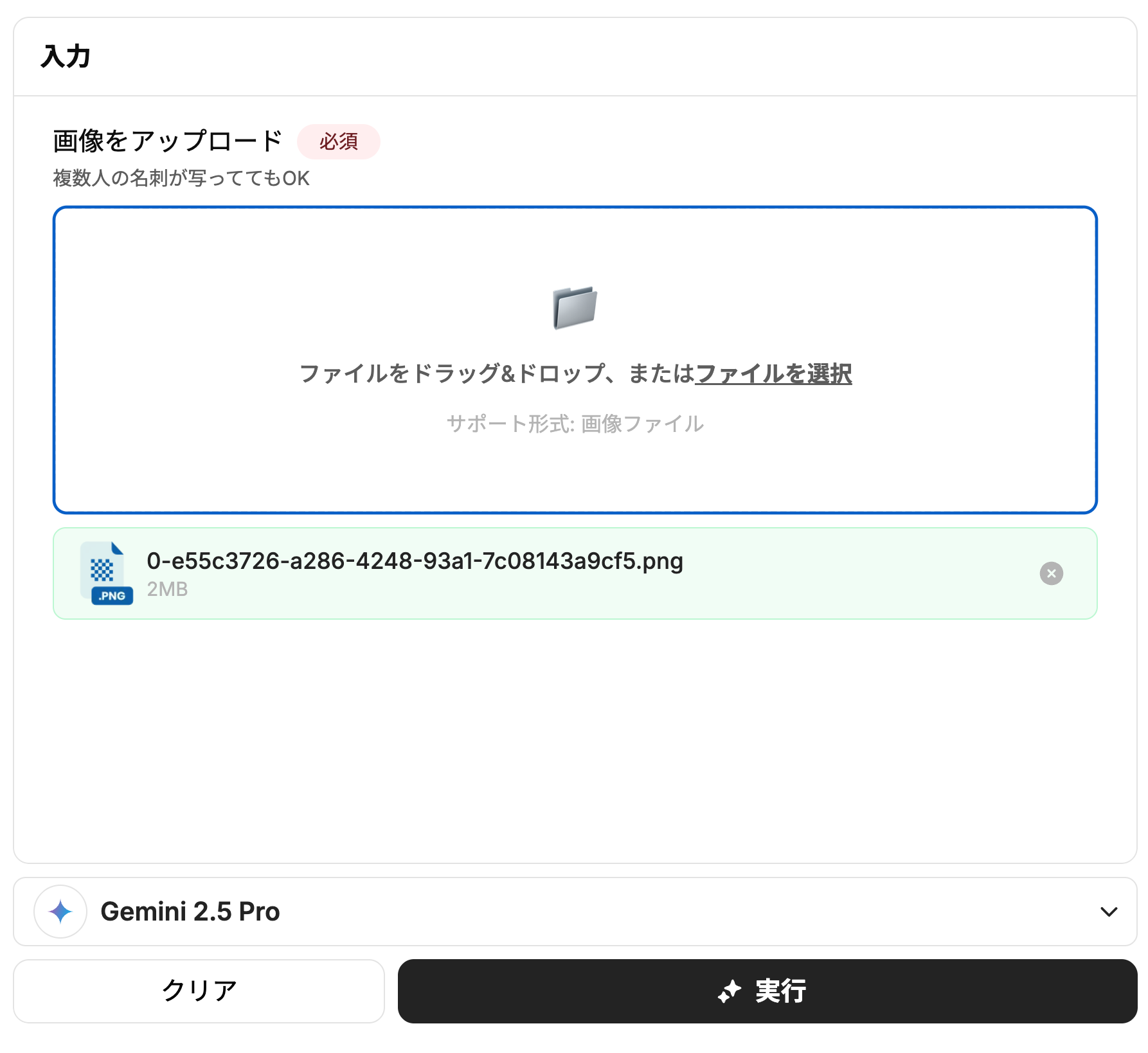 アップロードして数秒待つと、AIが画像内の名刺から会社名、氏名、メールアドレス、電話番号を正確に抽出してくれます。複数枚の名刺があっても、それぞれ個別の情報として整理されるため、手入力の手間や入力ミスがなくなります。これまで名刺整理にかけていた時間を大幅に削減し、顧客管理をスピーディーに開始できます。