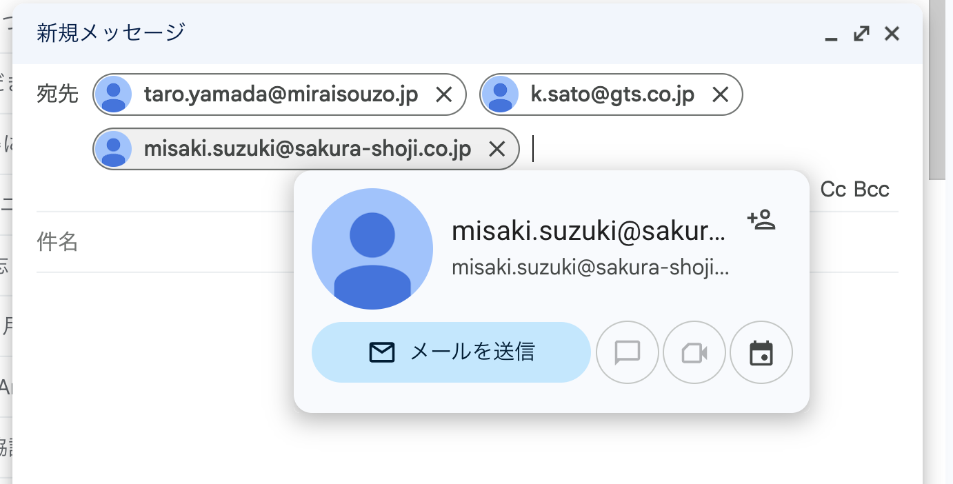 このままメールアドレスの部分を丸々コピーしてGmailに貼り付けるだけで、一気にメール送付先を登録することが可能です。