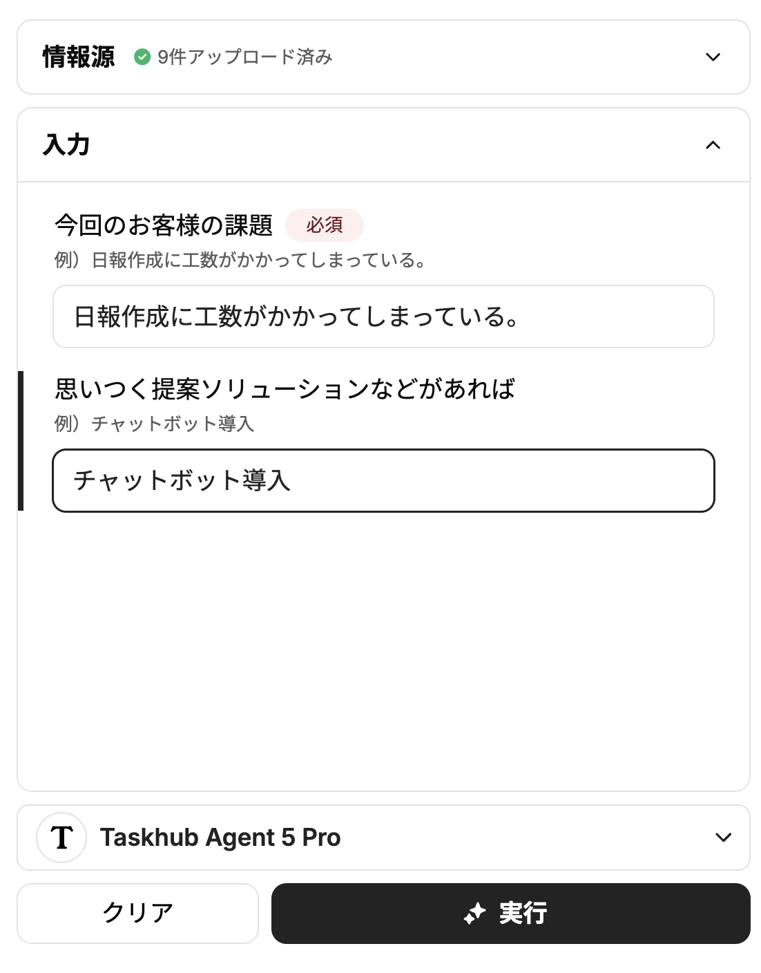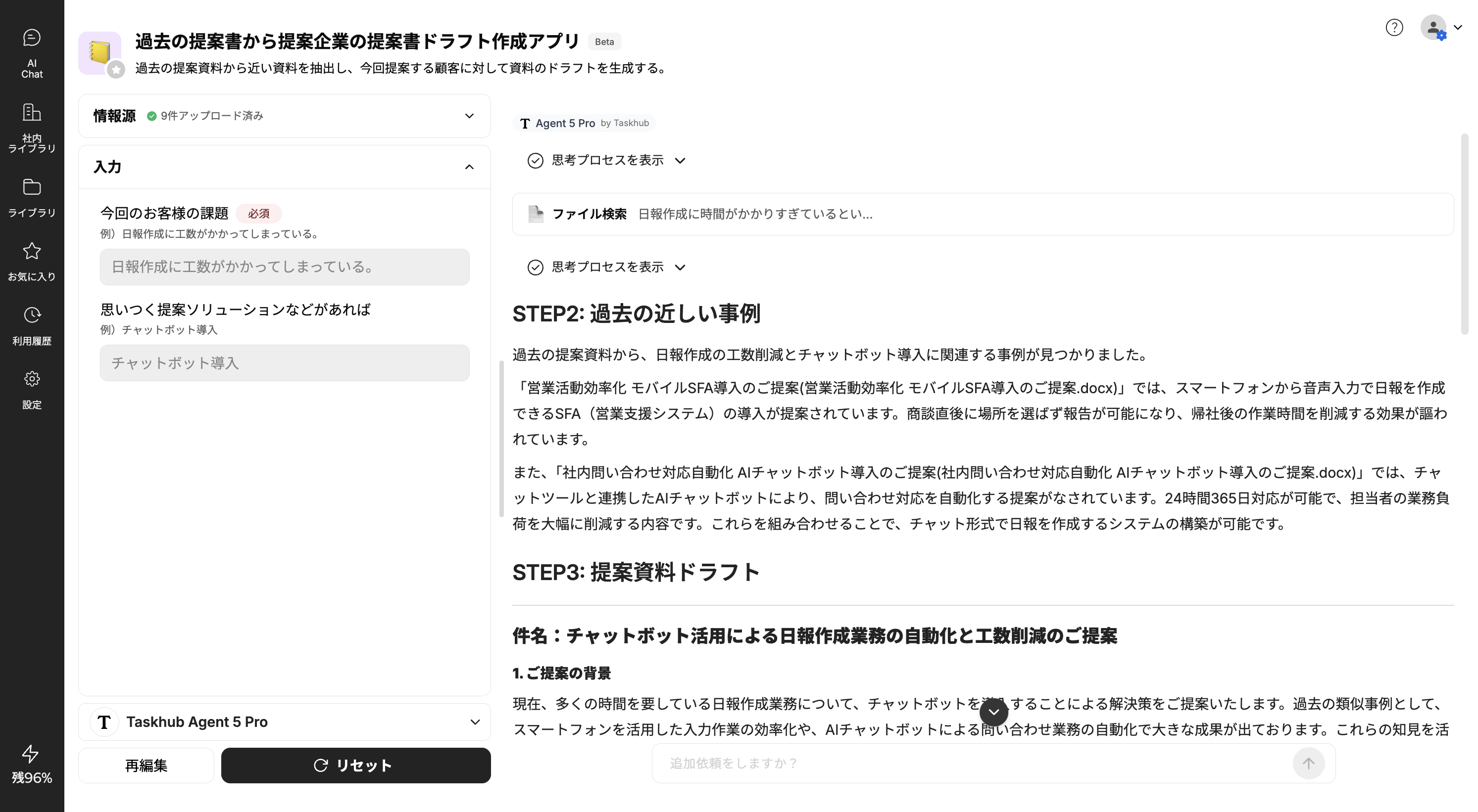 Taskhubの画面で、参照させたい過去の提案資料などをアップロードし、「日報作成に工数がかかってしまっている」といった顧客の課題と、「チャットボット導入」といった提案の方向性をフォームに入力します。