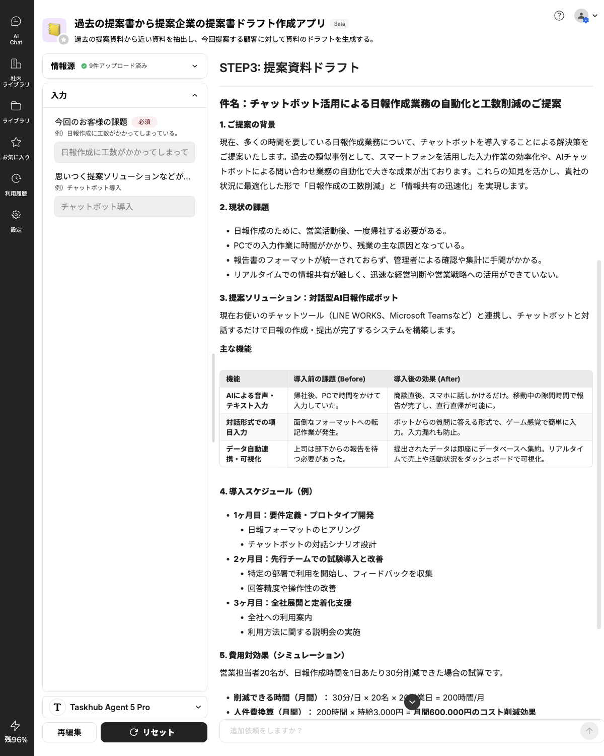 提案書のドラフトが即座に出力される