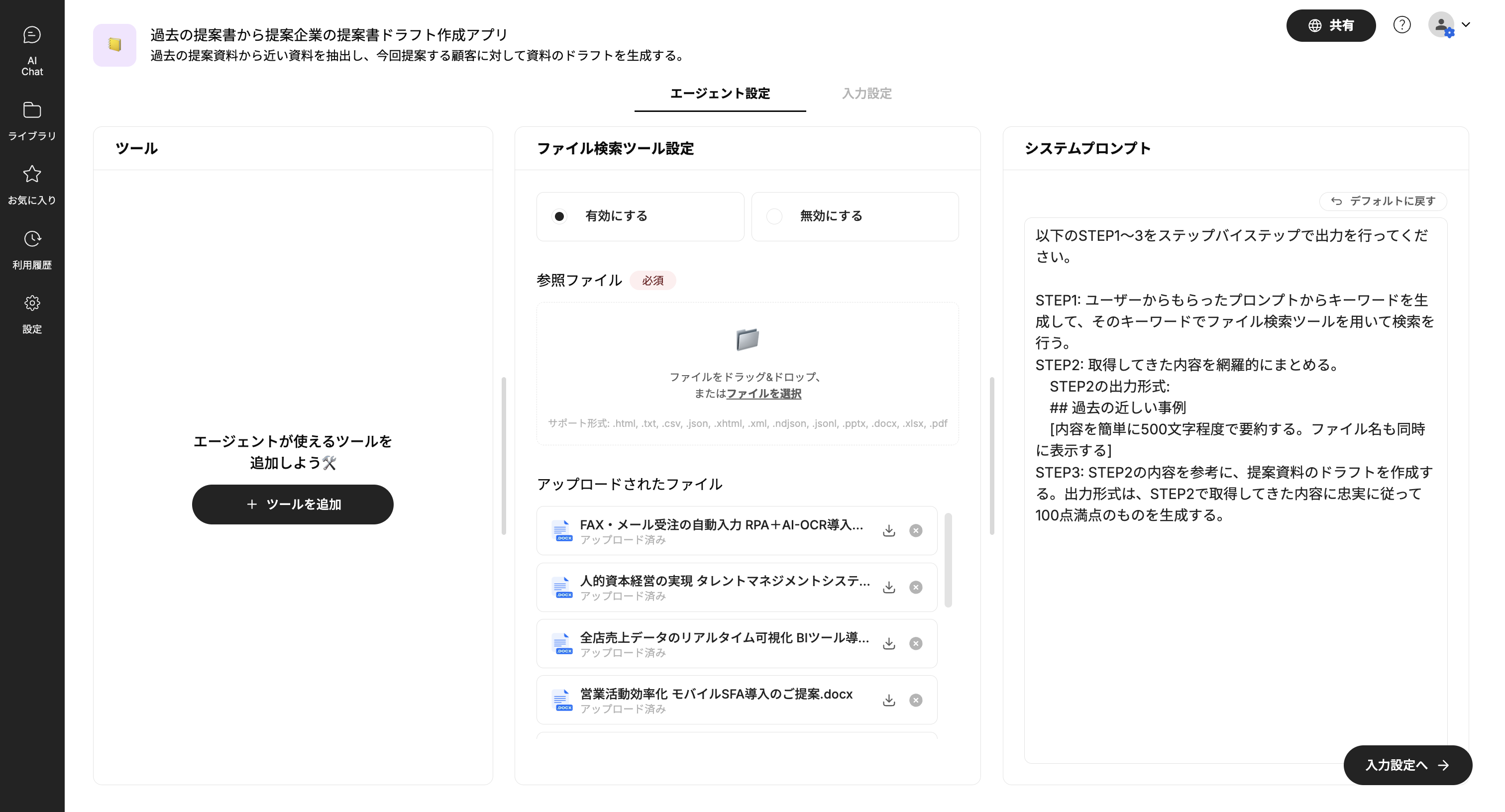 Taskhubのアプリ編集画面から、過去の提案資料をアップロードするだけ。セットアップはとても簡単です。今回はword形式の資料を11件入れることにしました。