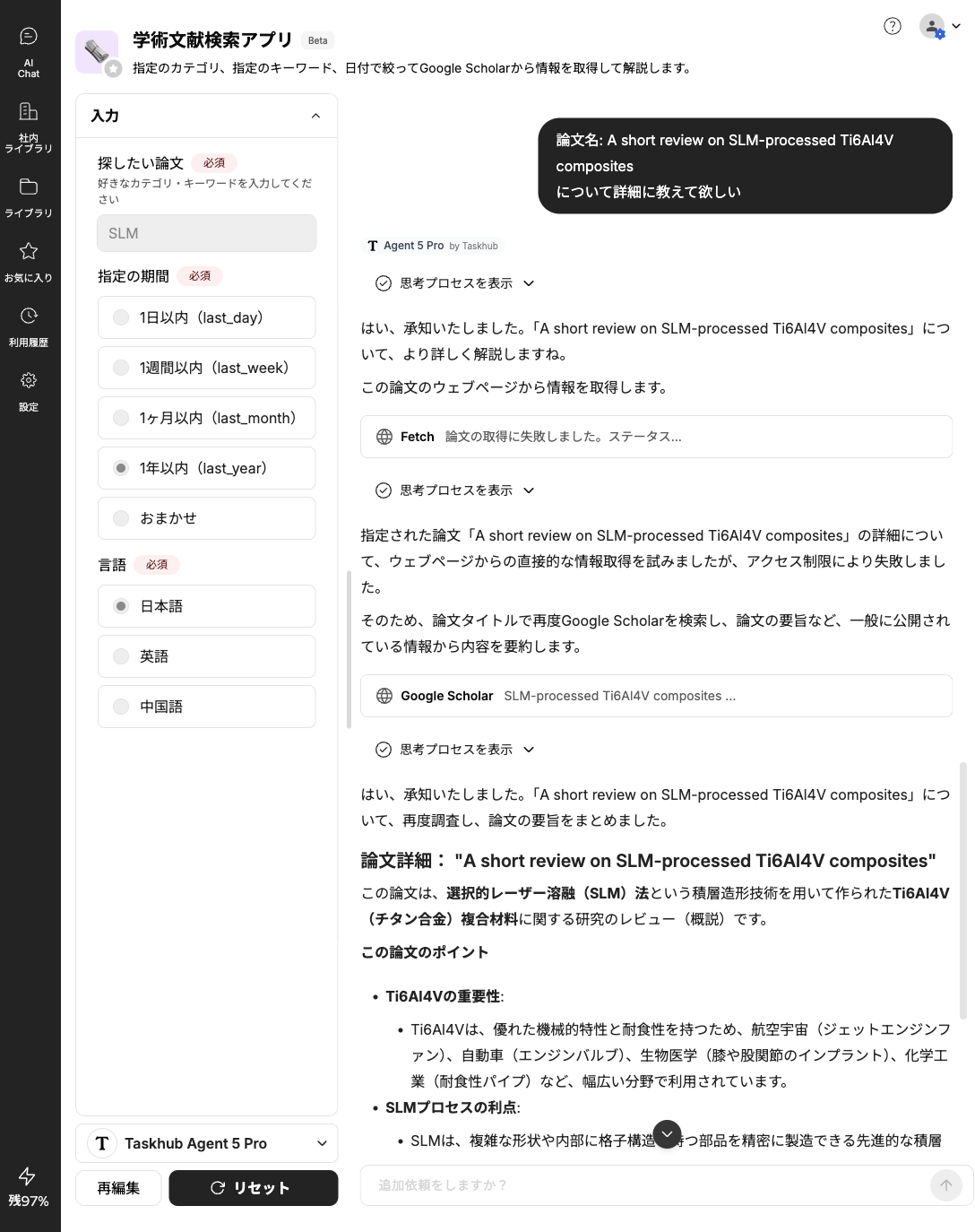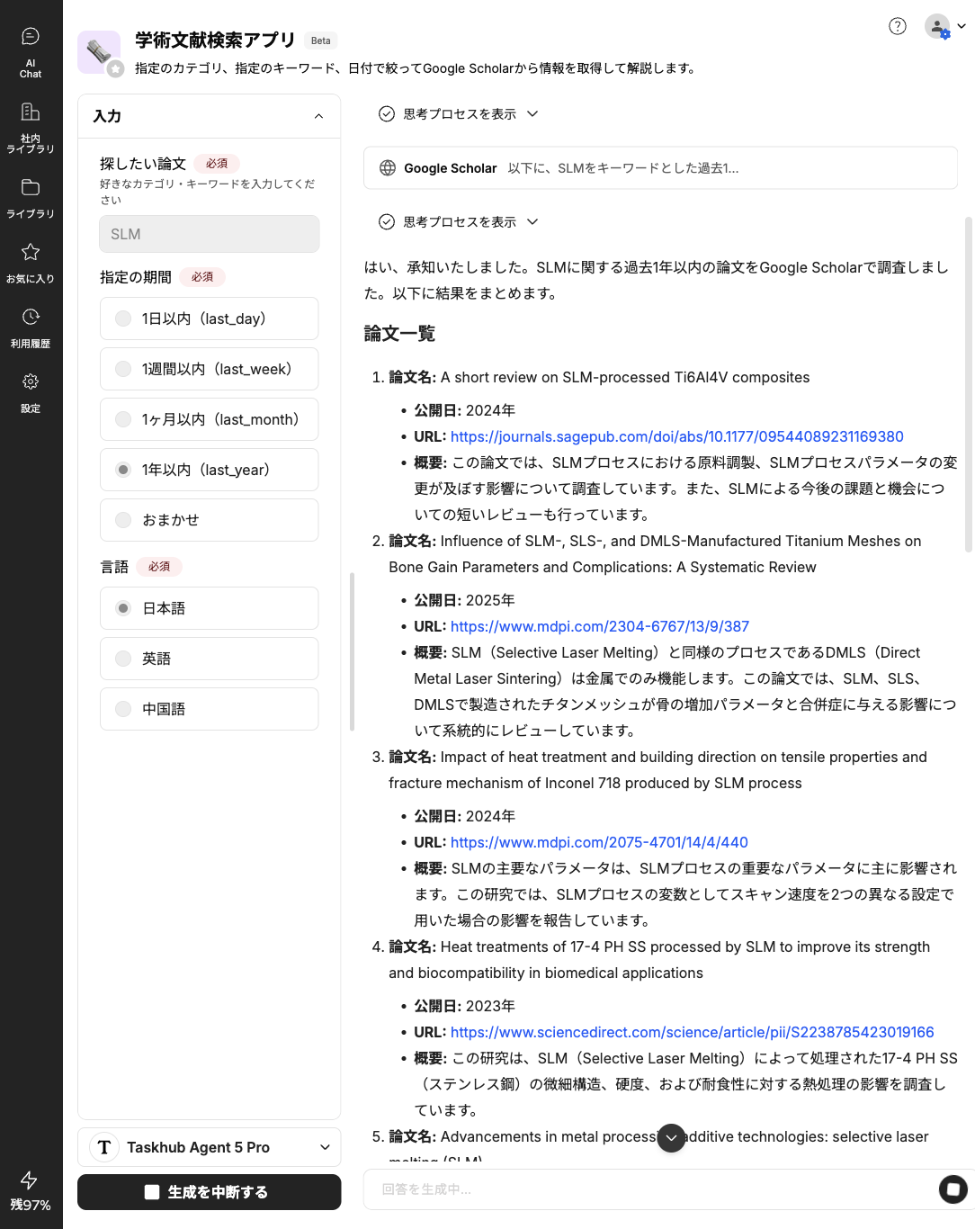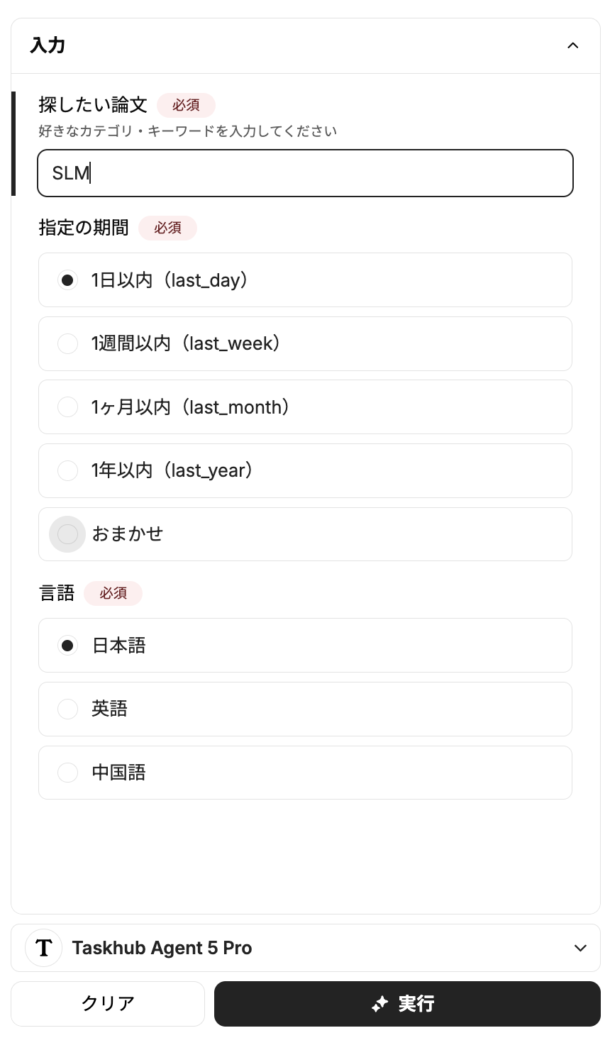 Taskhubの画面で、探したい論文のキーワード、検索したい期間、言語などの条件をフォームに入力し、「実行」ボタンをクリックします。