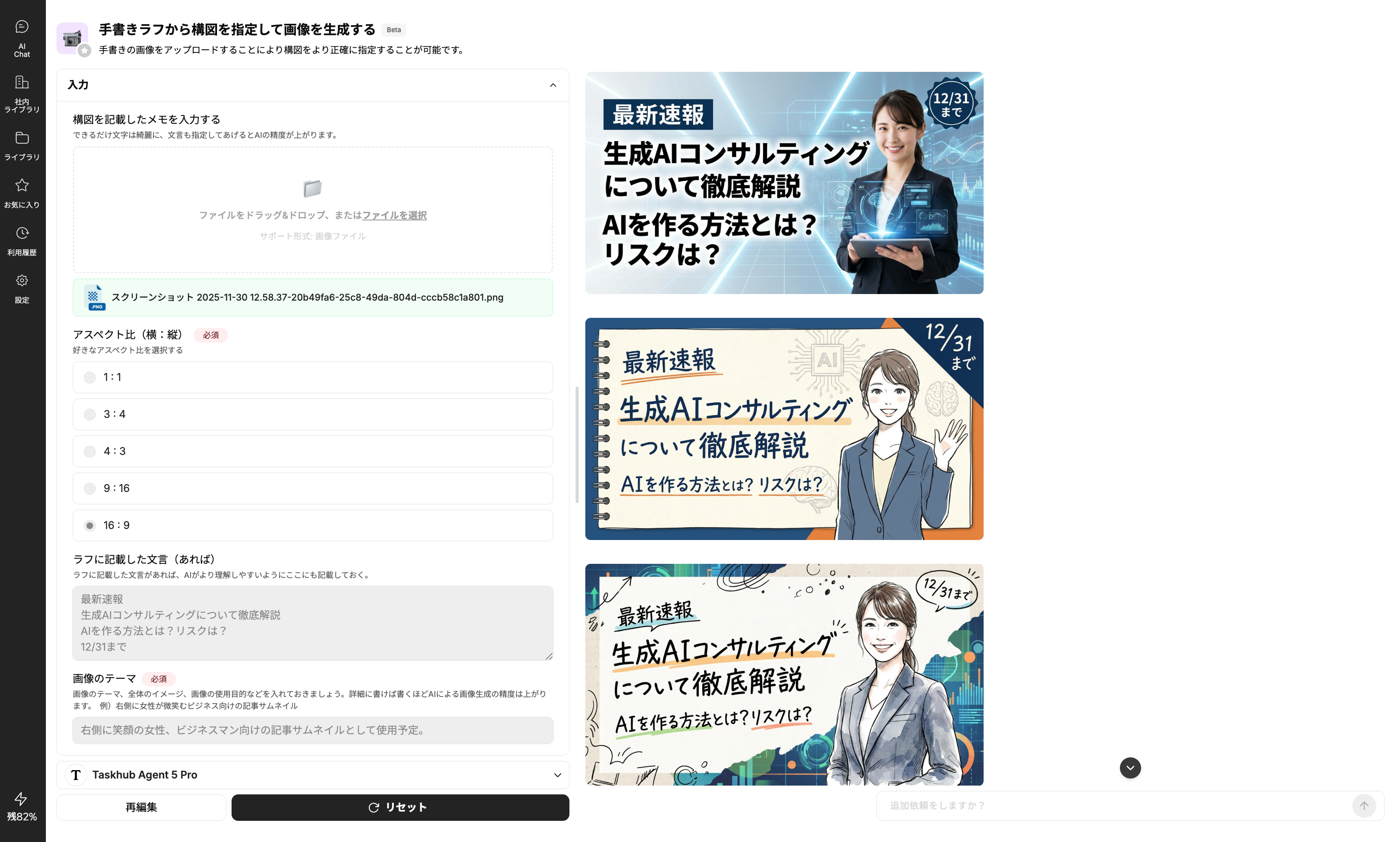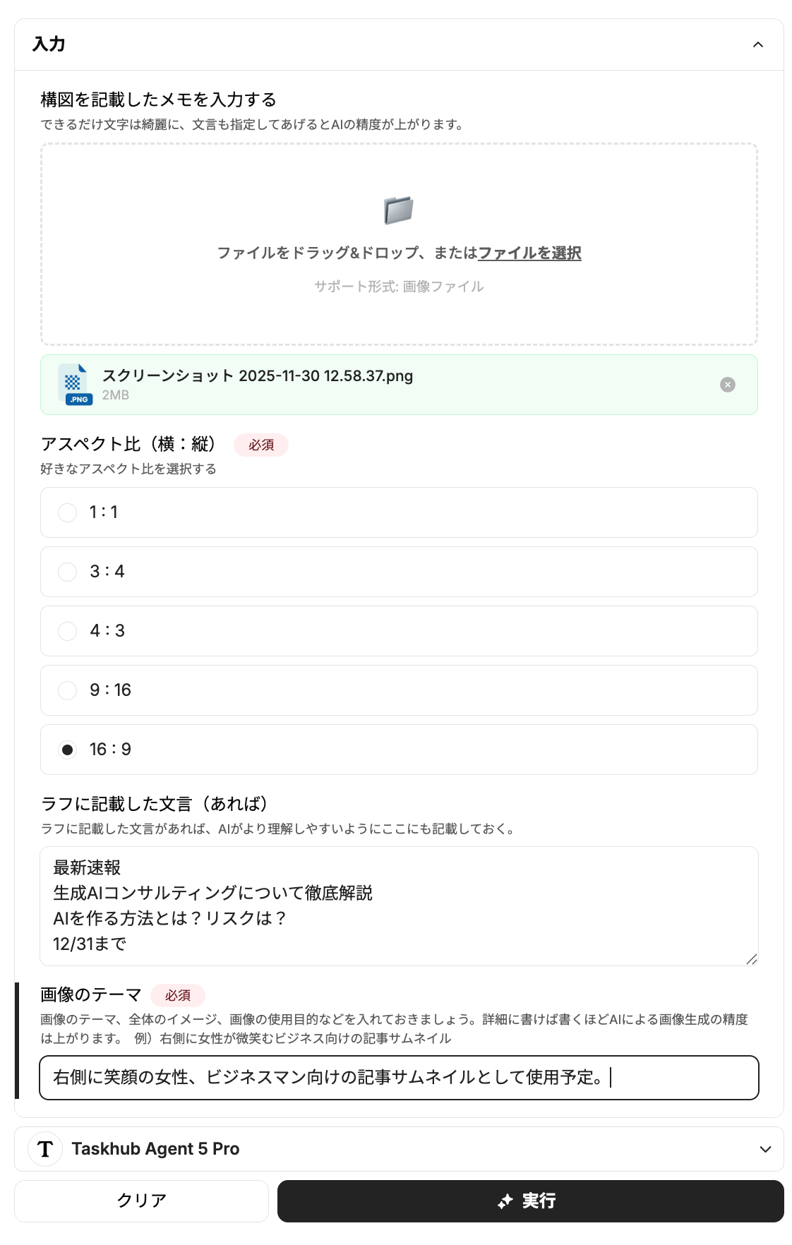 Taskhubの画面で、構図をメモした手書きのラフ画をアップロードし、アスペクト比を選択します。さらに「右側に笑顔の女性、ビジネスマン向けの記事サムネイル」といった画像のテーマや、画像内に入れたいテキストを入力します。