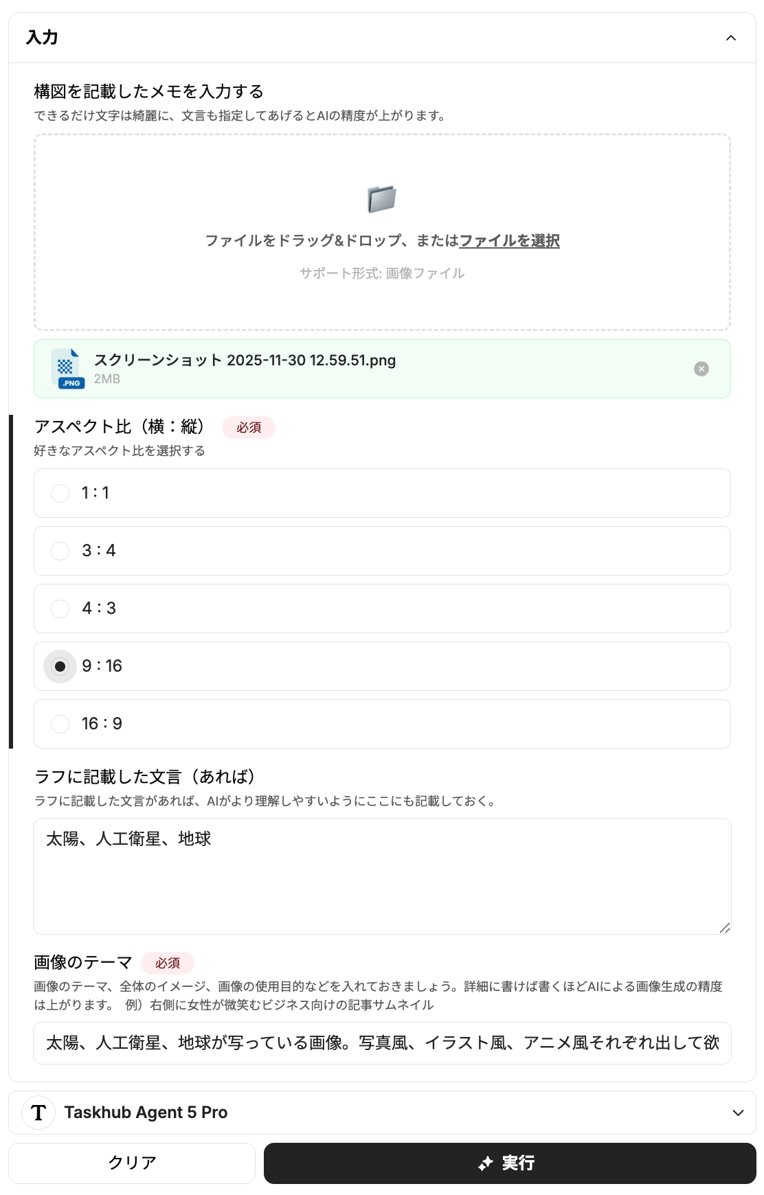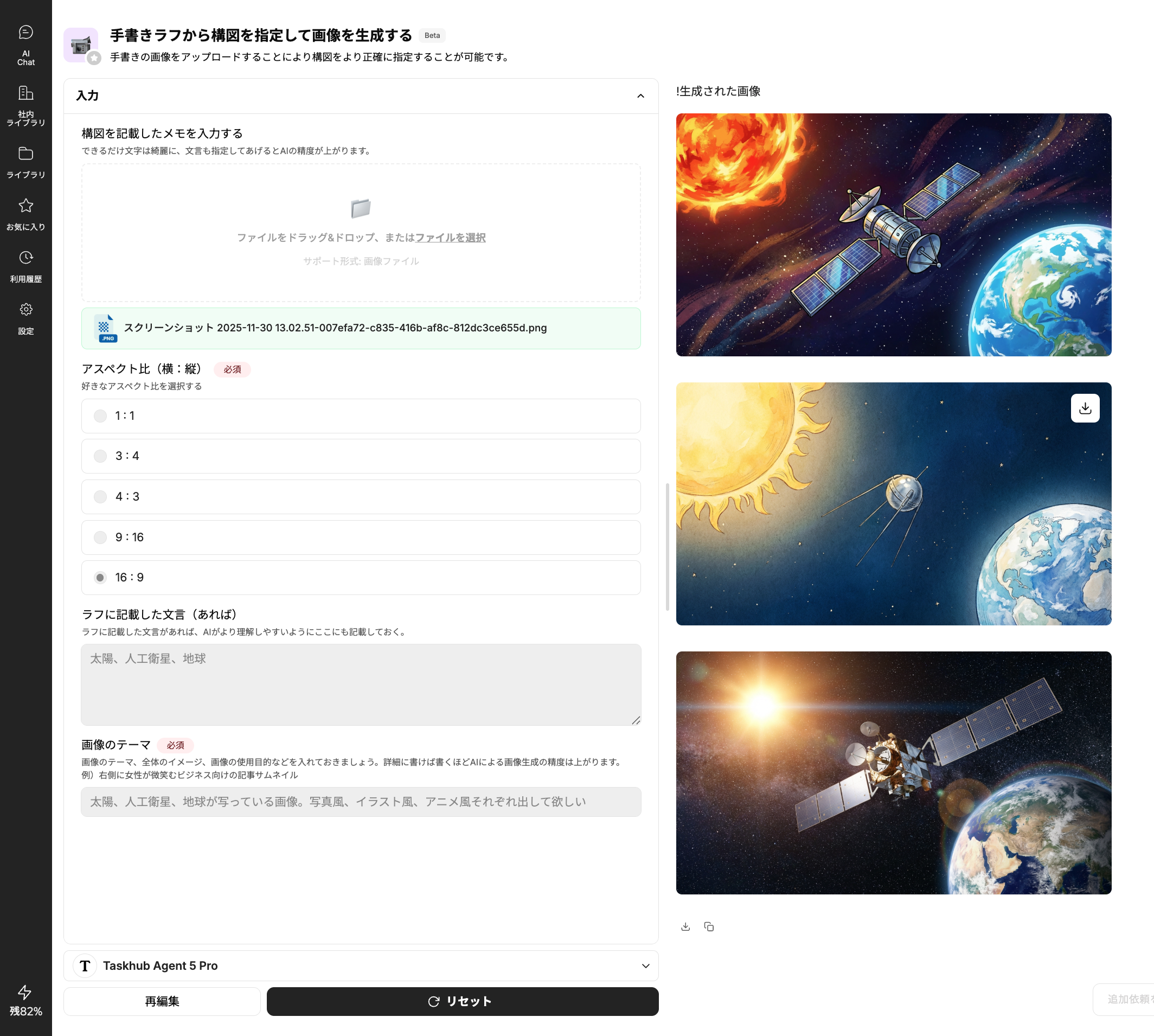Taskhubの画面で、構図を描いた手書きのラフ画をアップロードします。アスペクト比を選択し、「太陽、人工衛星、地球が写っている画像。写真風、イラスト風、アニメ風それぞれ出して欲しい」といった自然言語で作りたい画像のテーマやイメージを入力します。