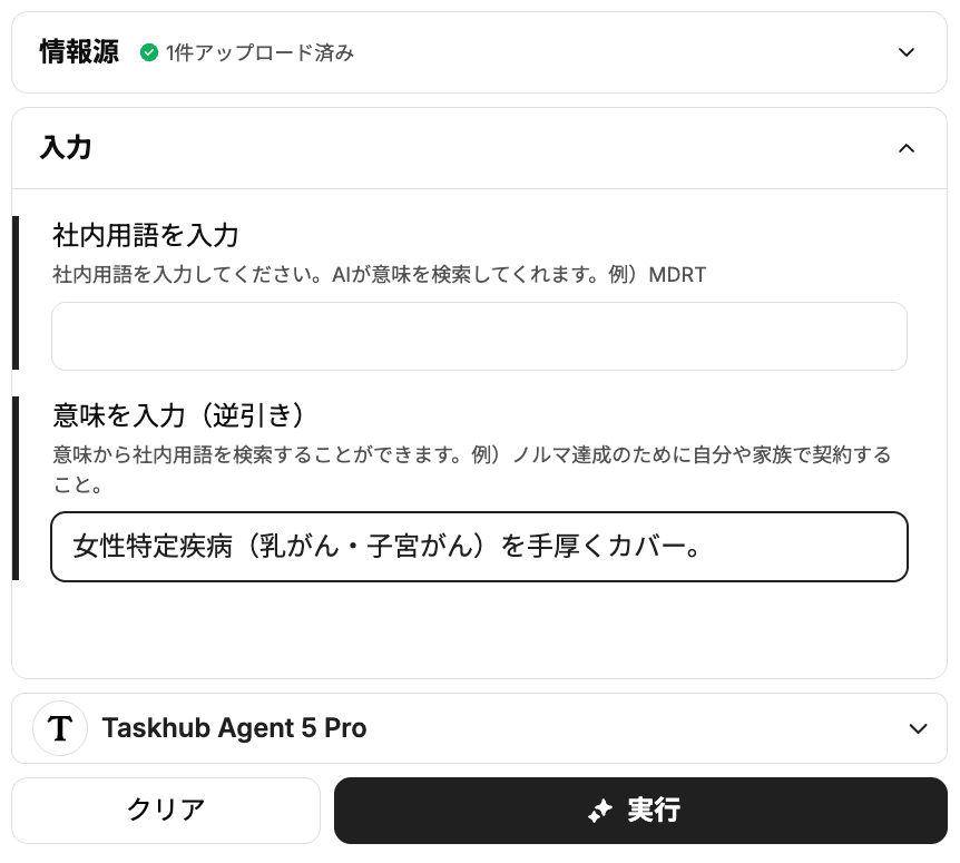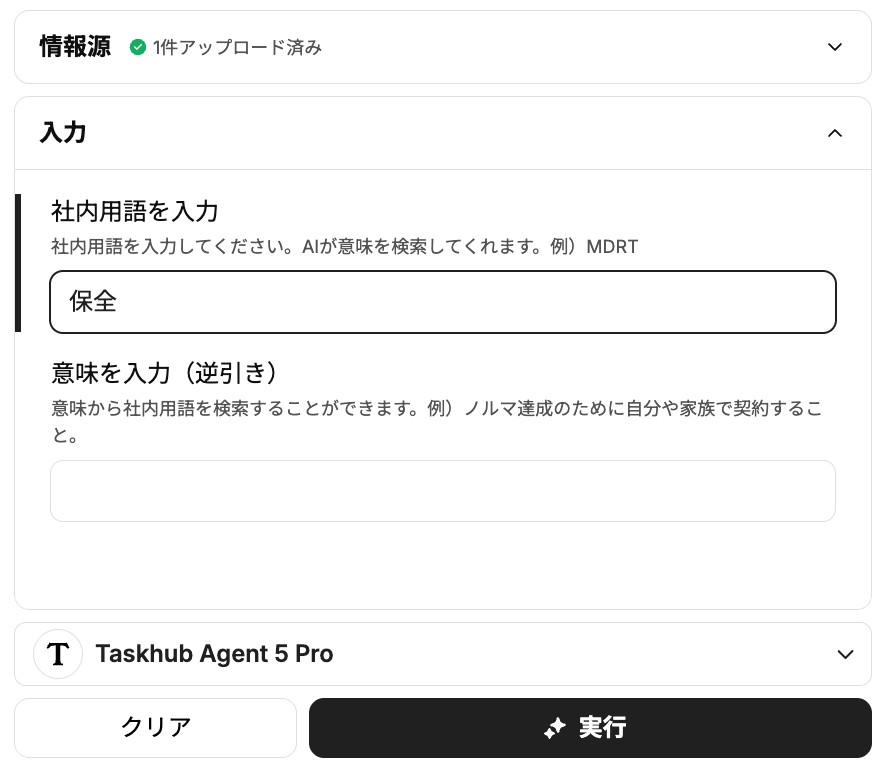 Taskhubの画面で、意味を知りたい社内用語を「社内用語を入力」フォームに入力します。逆に、意味から該当する用語を調べる逆引き検索も可能です。