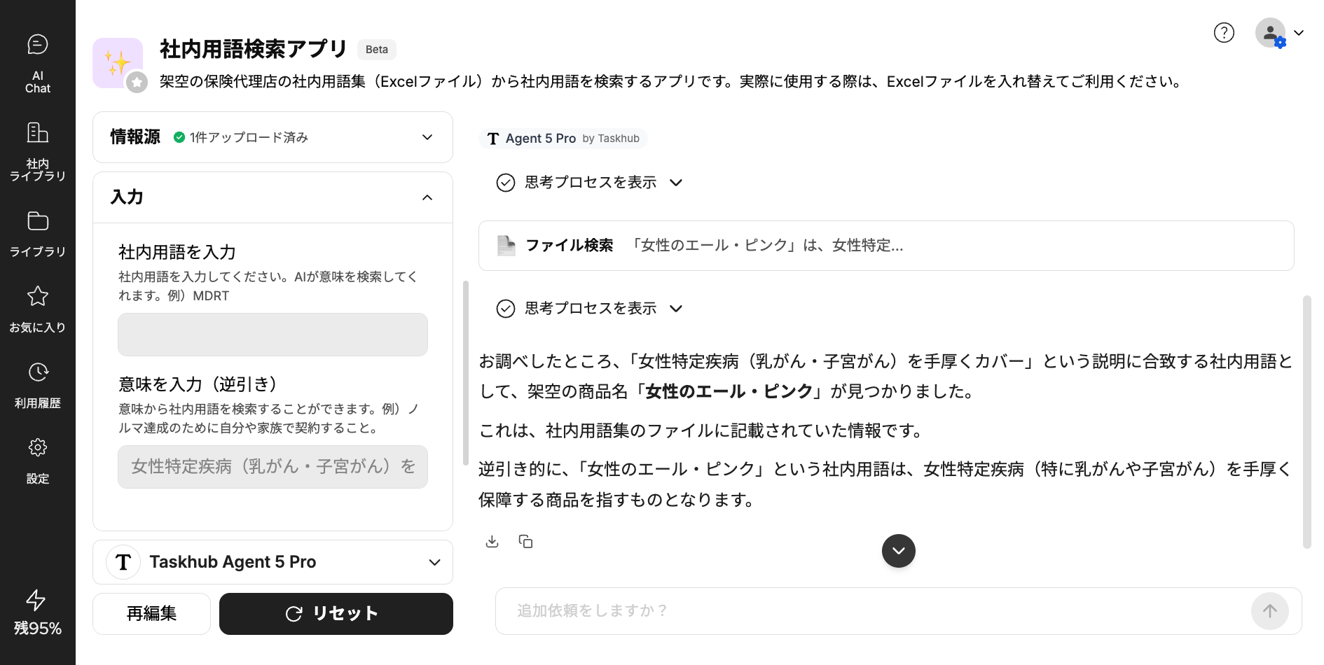 ✨ “意味”から検索できる: 「女性疾病を手厚くカバーする特約」のようなうろ覚えの内容からでも、AIが関連用語を提案。資料を探し回る手間がなくなり、顧客対応がスピードアップします。