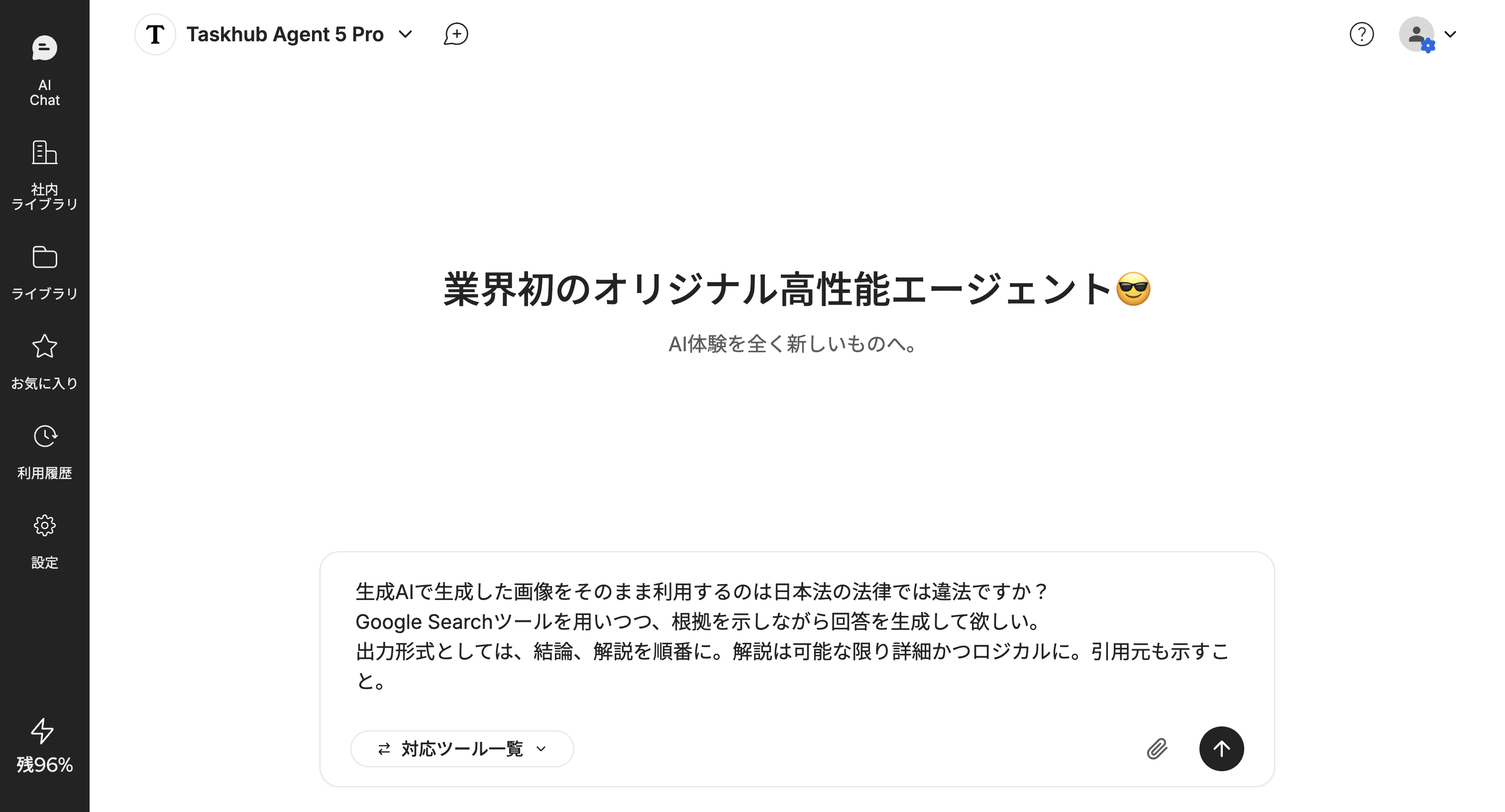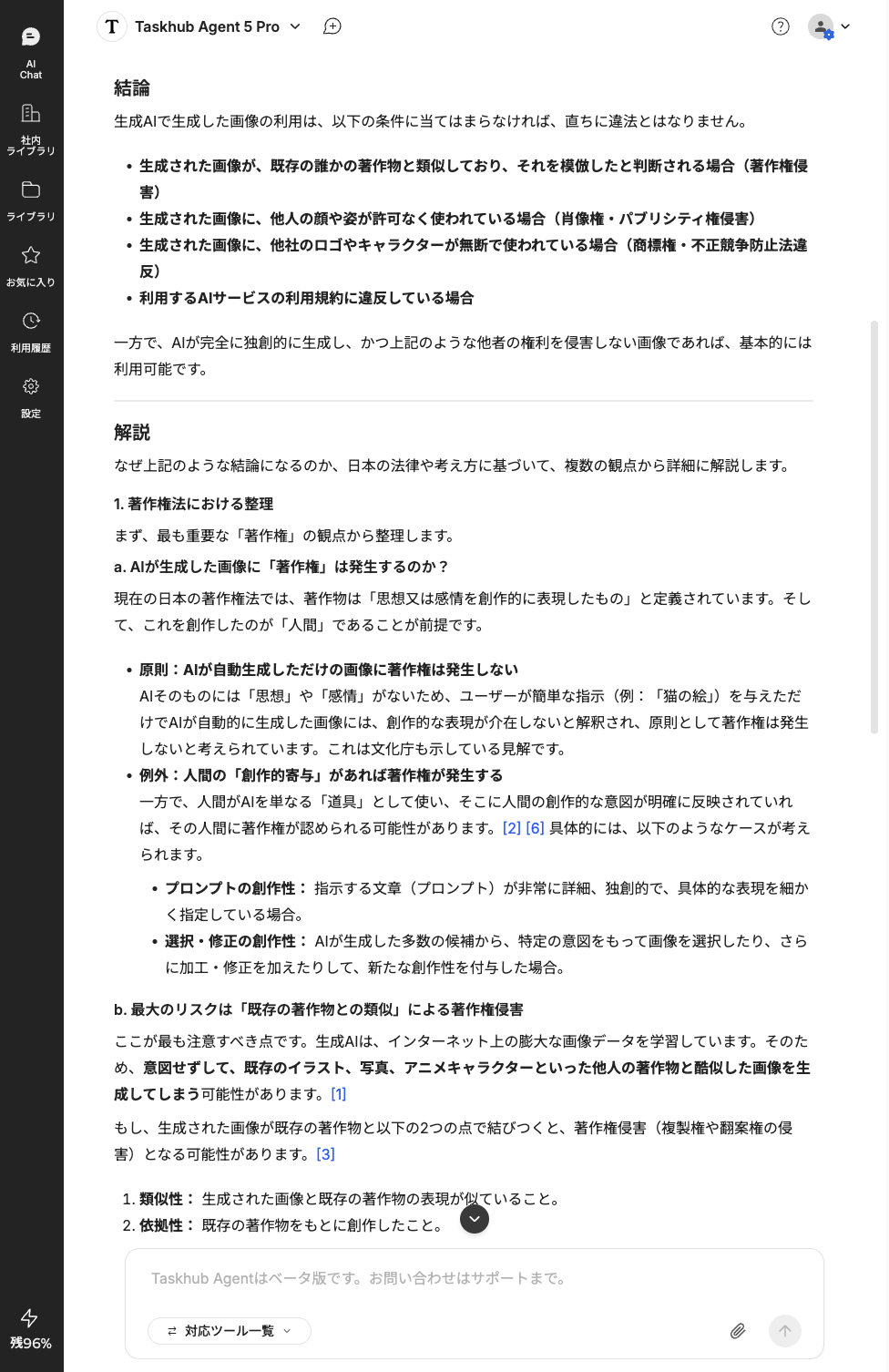 質問1つで即レポート完成: 「生成AIの著作権リスクは?」といった複雑な質問を投げるだけで、AIがWeb検索から情報整理までを代行。結論や解説が構造化されたレポート形式で瞬時に出力されます。
