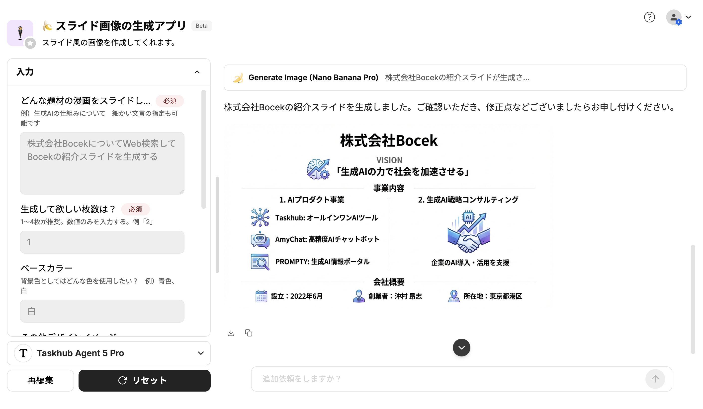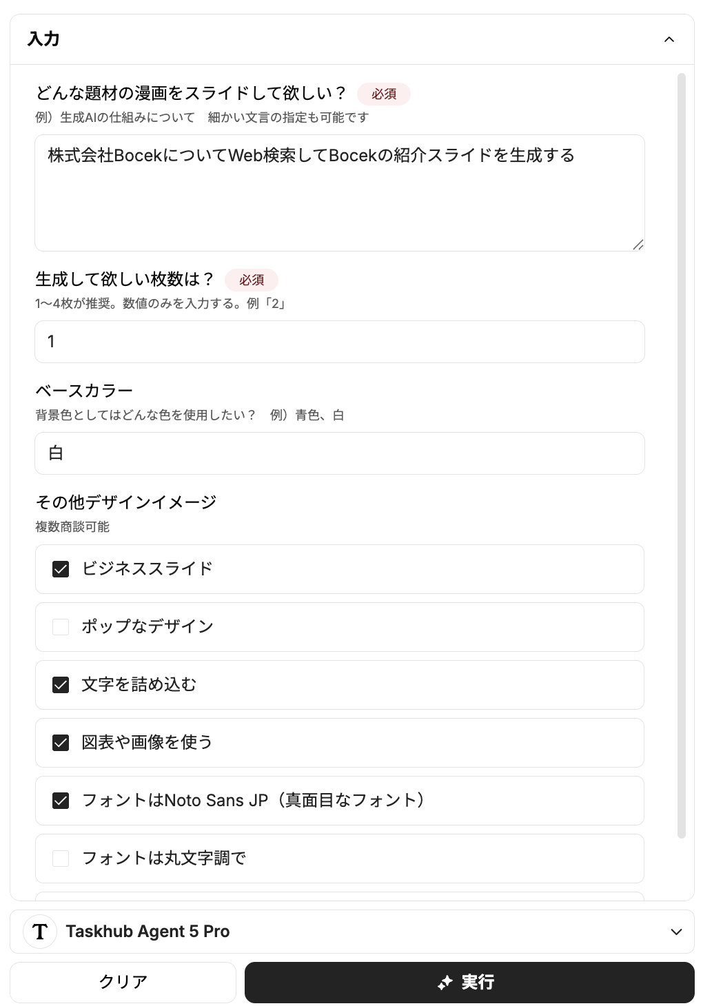 Taskhubの画面で、作りたいスライドの題材、枚数、デザインイメージなどを入力します。今回は「株式会社BocekについてWeb検索してBocekの紹介スライドを生成する」といった自然言語の指示も加えています。