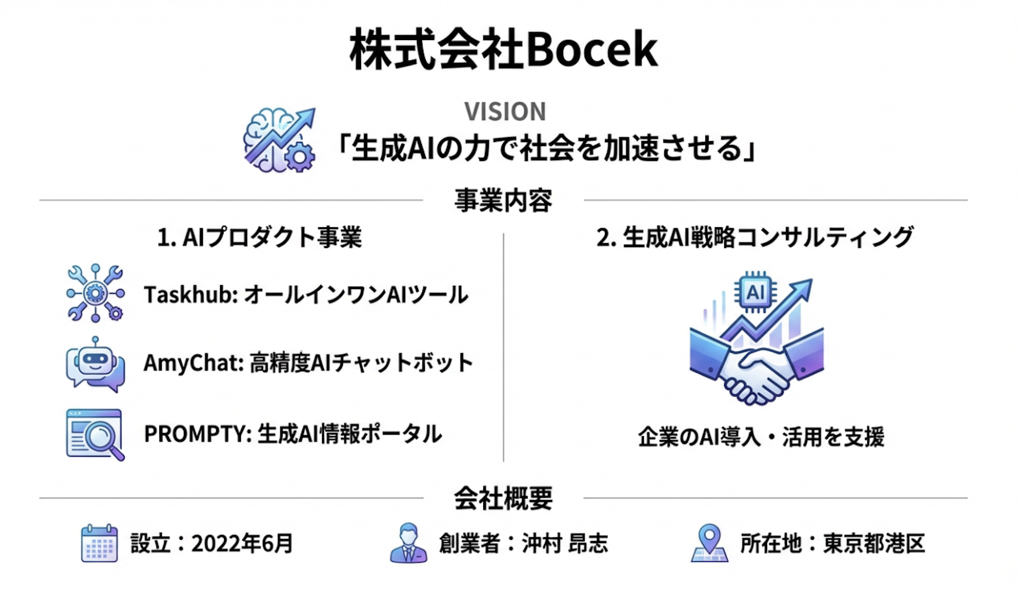 入力して数秒待つと、指示に基づいたスライド画像が生成されます。今回はWeb検索の指示も加えたため、AIが株式会社Bocekの情報を自動で収集・要約し、見やすいスライド形式でアウトプットしてくれました。デザインや構成を考える手間が省け、資料作成の時間を大幅に短縮できます。