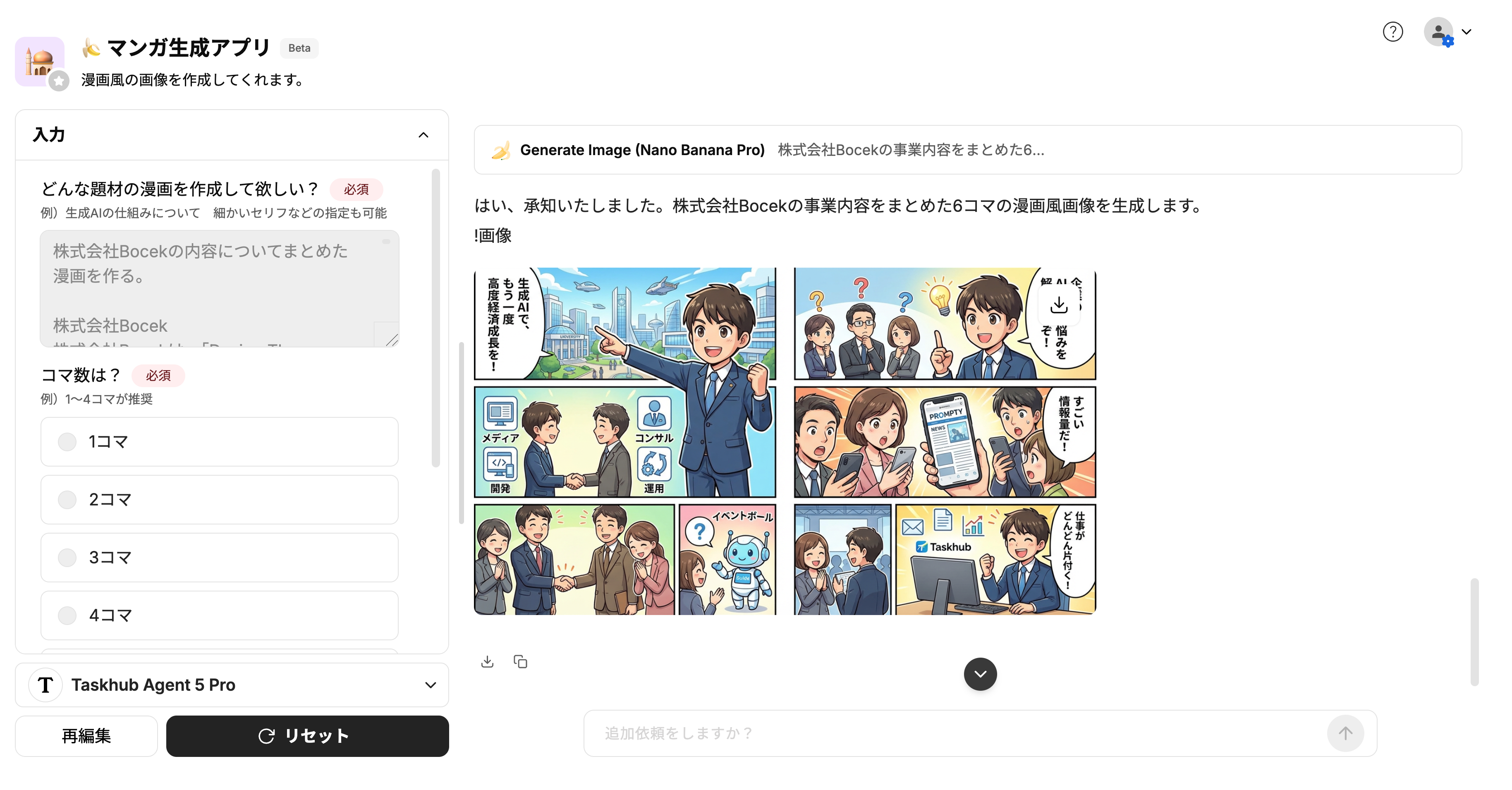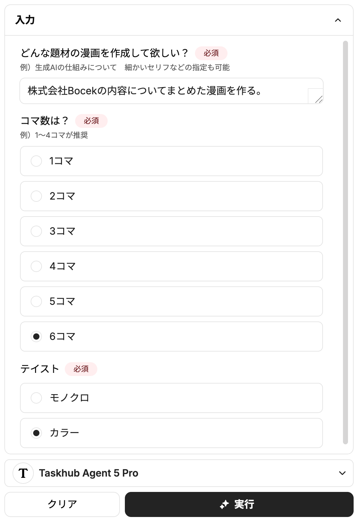 Taskhubの画面で、作りたい漫画の題材、コマ数、テイストなどをフォームに入力します。「株式会社Bocekの内容についてまとめた漫画を作る」といった簡単な指示でOKです。
