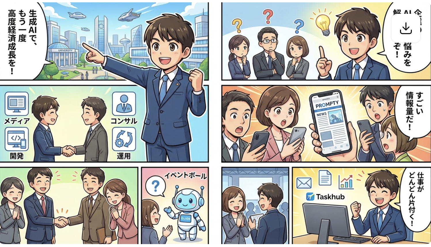 ✨ 誰でも即日コンテンツ制作: 専門知識は一切不要。思いついたアイデアをすぐに漫画化できるため、広報資料やSNS投稿用のコンテンツが即日完成する。