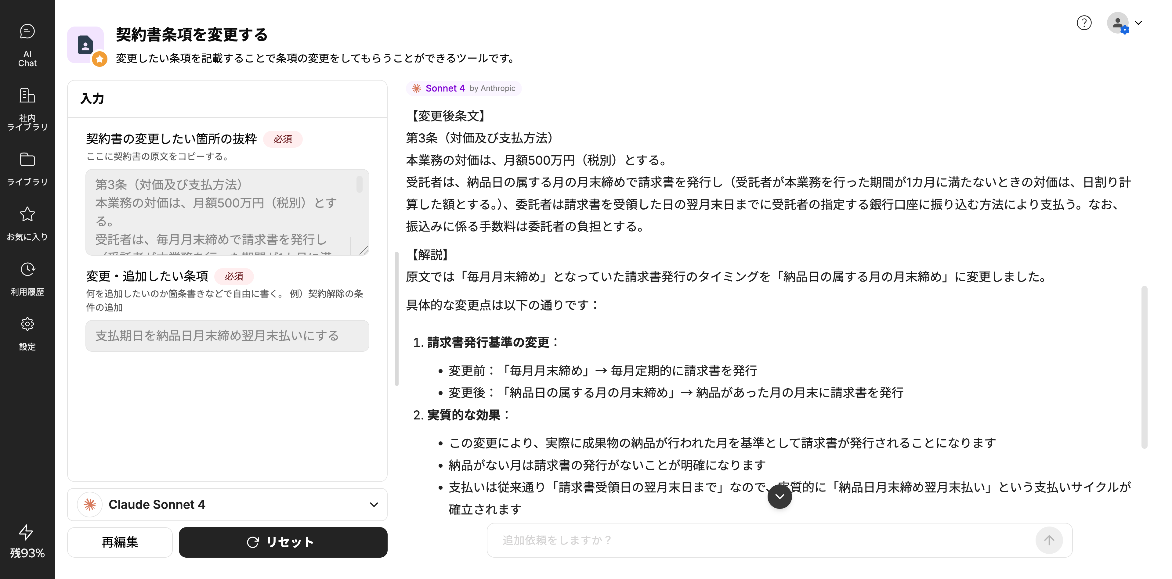 入力して数秒待つと、変更後の契約書条文だけではなく、修正の方針に関する解説も一緒に示してくれます。