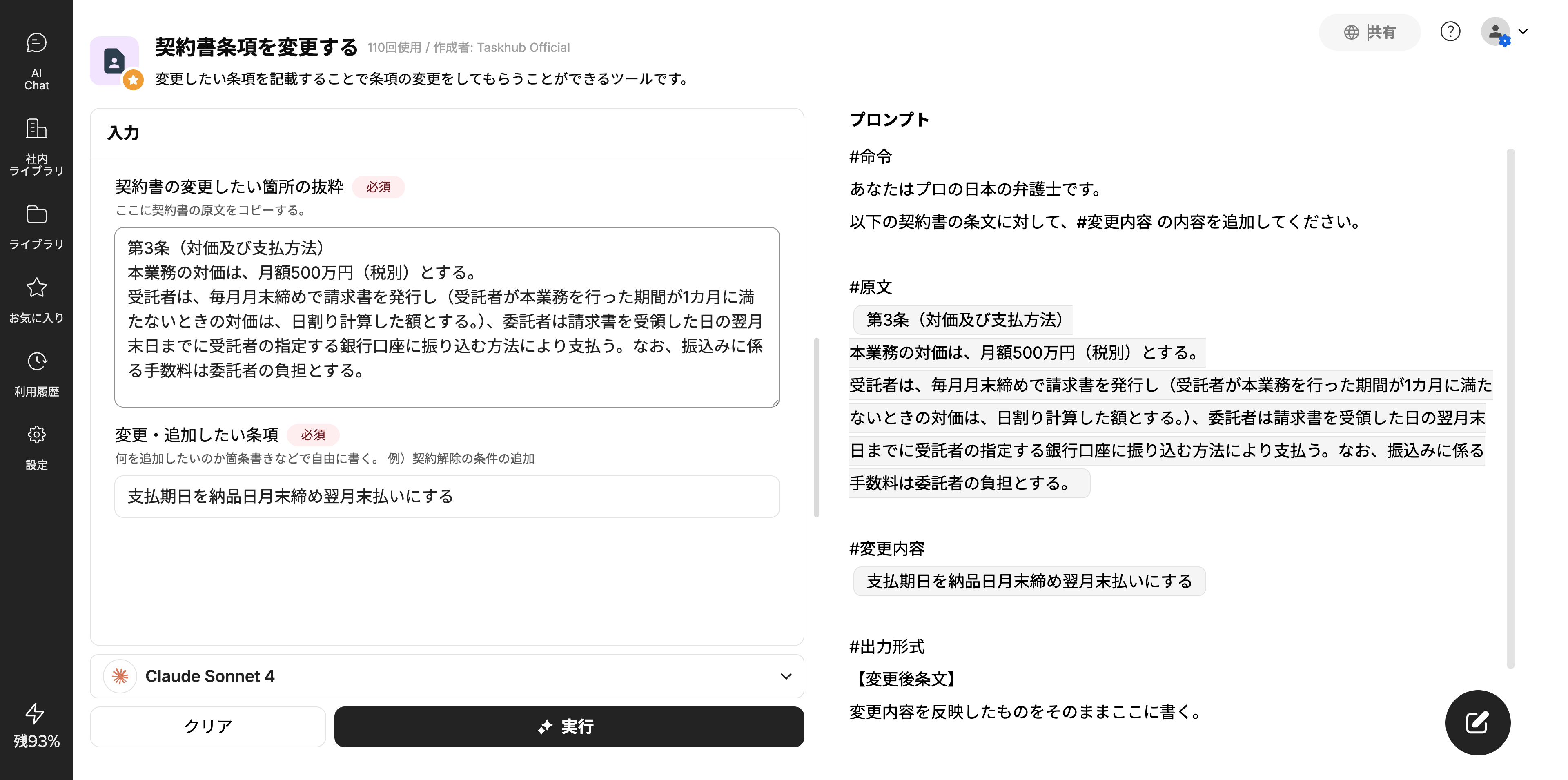 Taskhubの画面で、修正したい原文と「支払期日を納品月末締め翌月末払いに変更して」といった自然言語の指示を入力します。