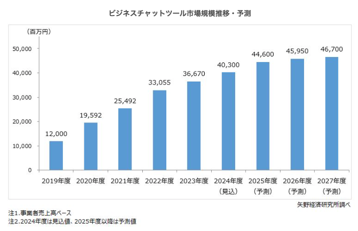 対話型AIの国内市場規模は年々拡大しており、今後も多くの企業で導入が進むと予測されています。詳しい市場調査の結果はこちらをご覧ください。 https://www.yano.co.jp/press-release/show/press_id/3728