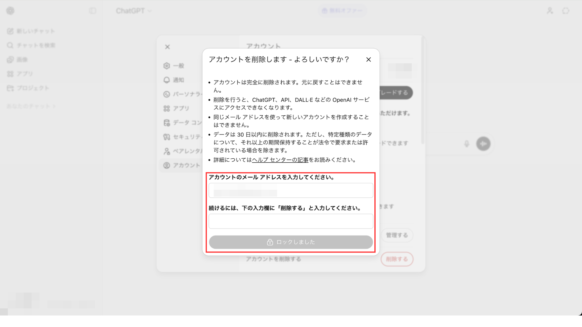 この操作を行うと、チャット履歴、保存されたデータ、APIキーなど、アカウントに紐づく全ての情報が不可逆的に消去されます。将来また使う可能性があるなら、無料プランのままアカウントを残しておく方が賢明です。