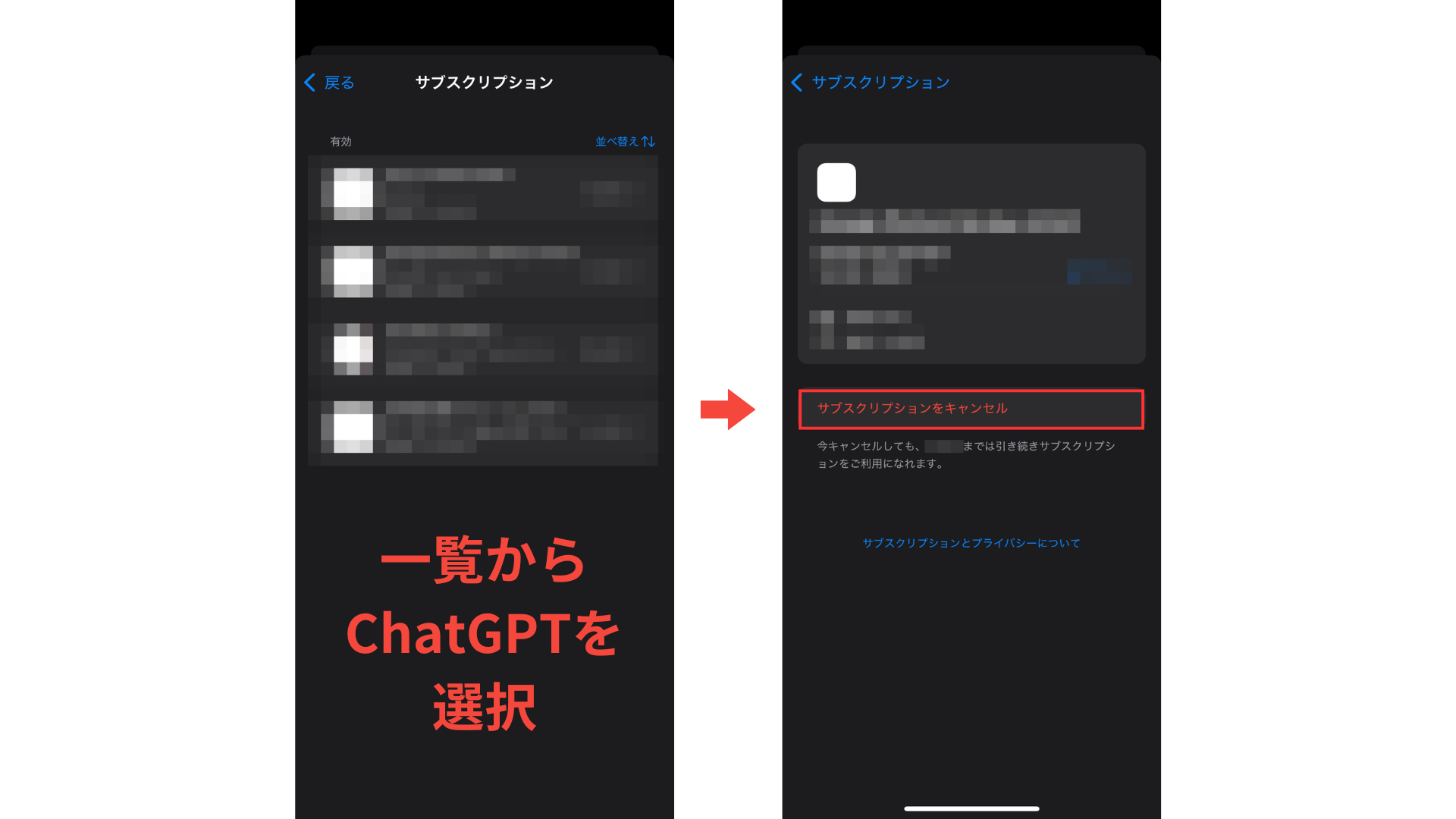 ステップ3:「ChatGPT」を選択し、「定期購入を解約」をタップ