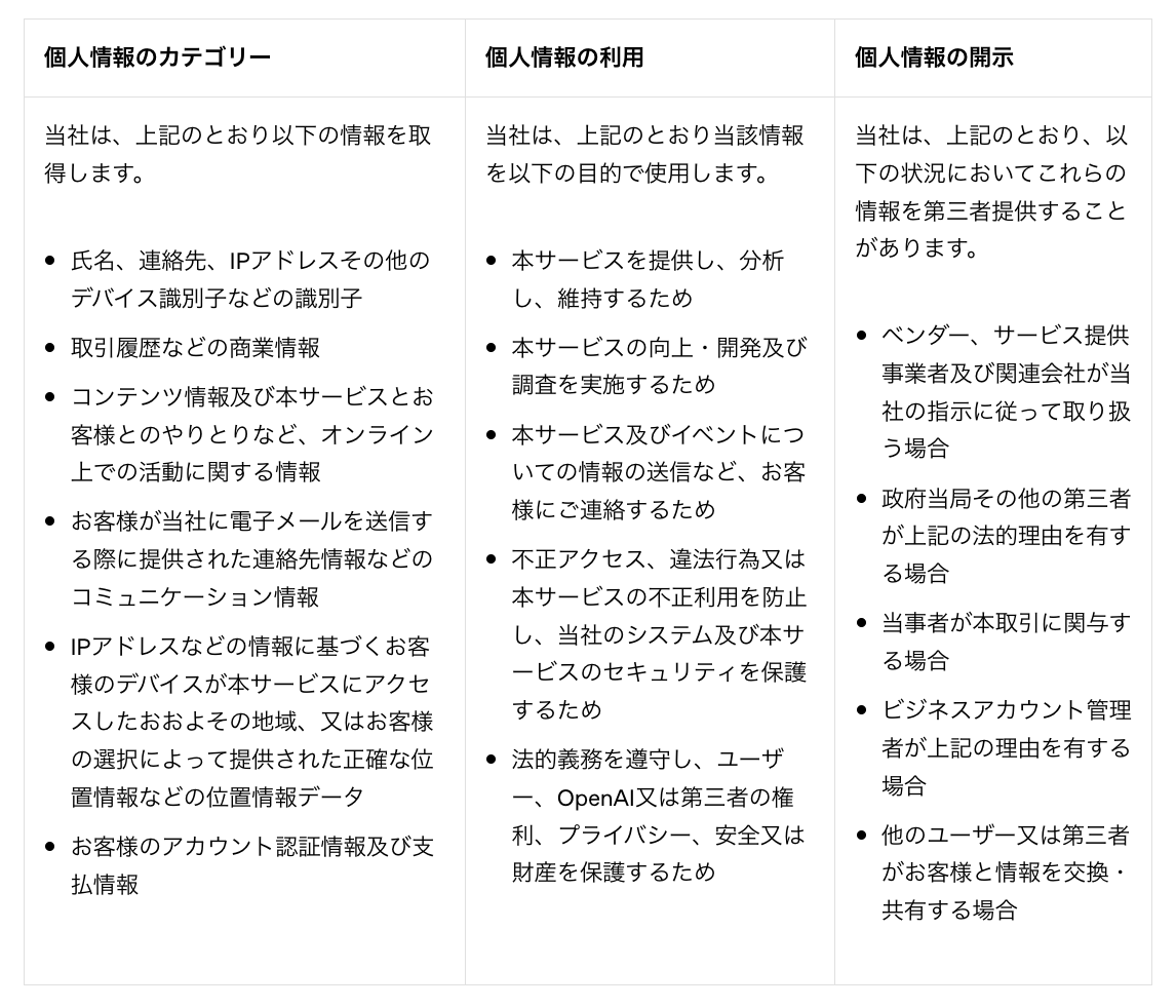 こちらはOpenAIのプライバシーポリシーに関する公式ページです。データ収集の範囲について詳しく知りたい方は合わせてご覧ください。 https://openai.com/policies/row-privacy-policy/
