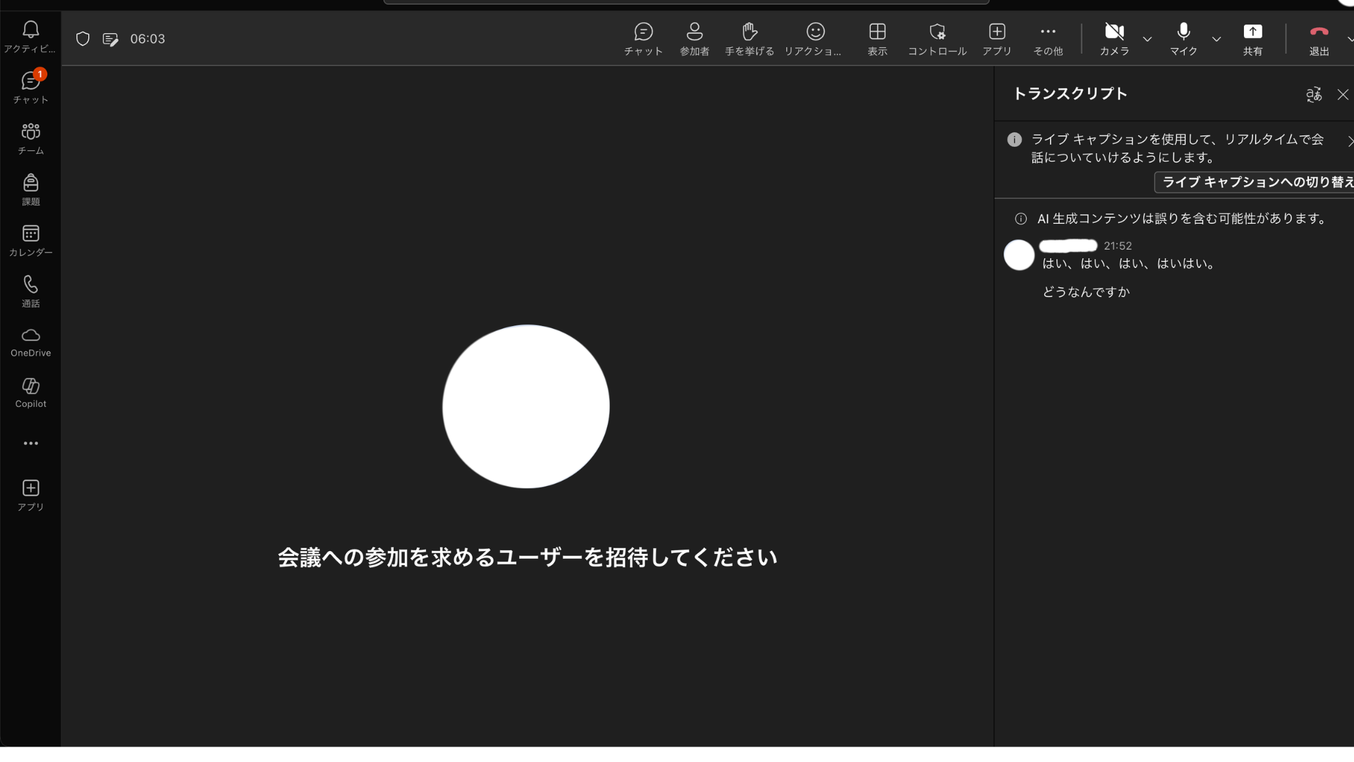 ステップ1:会議メニューの「レコーディングと文字起こし」から、文字起こしを開始する。