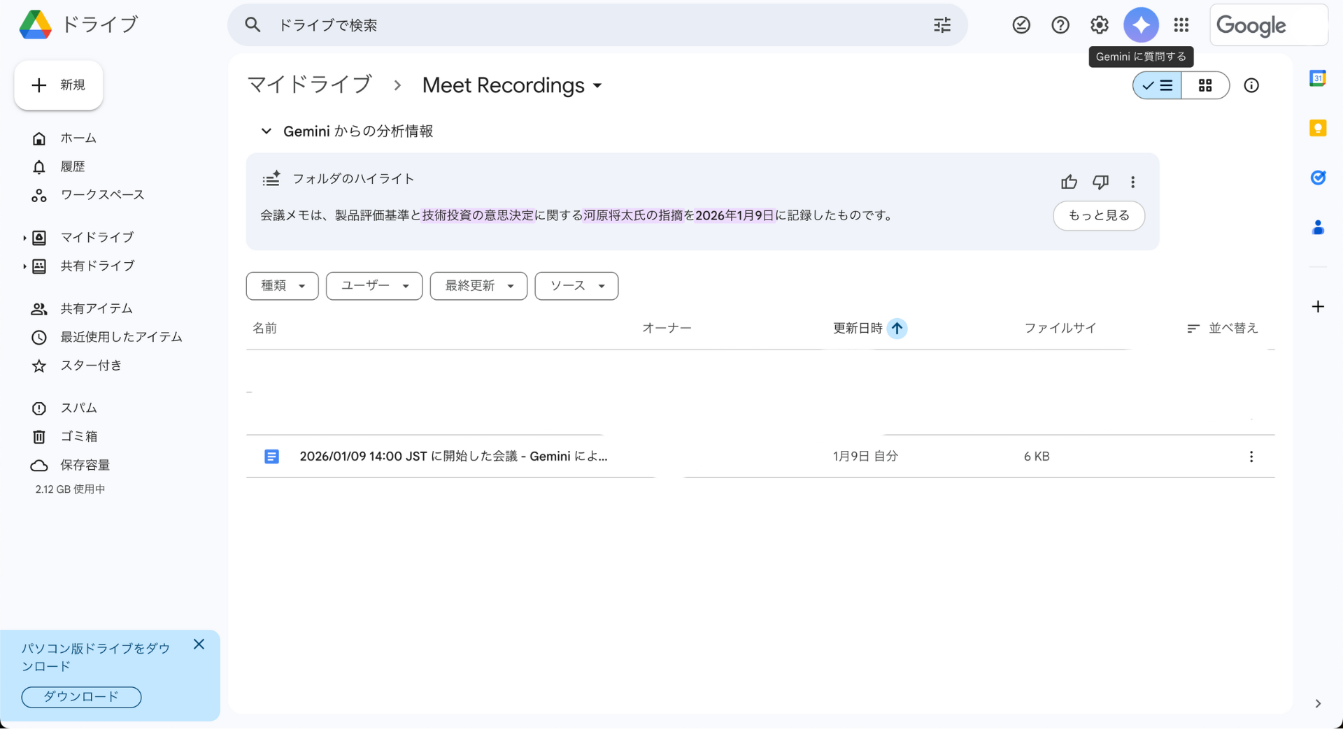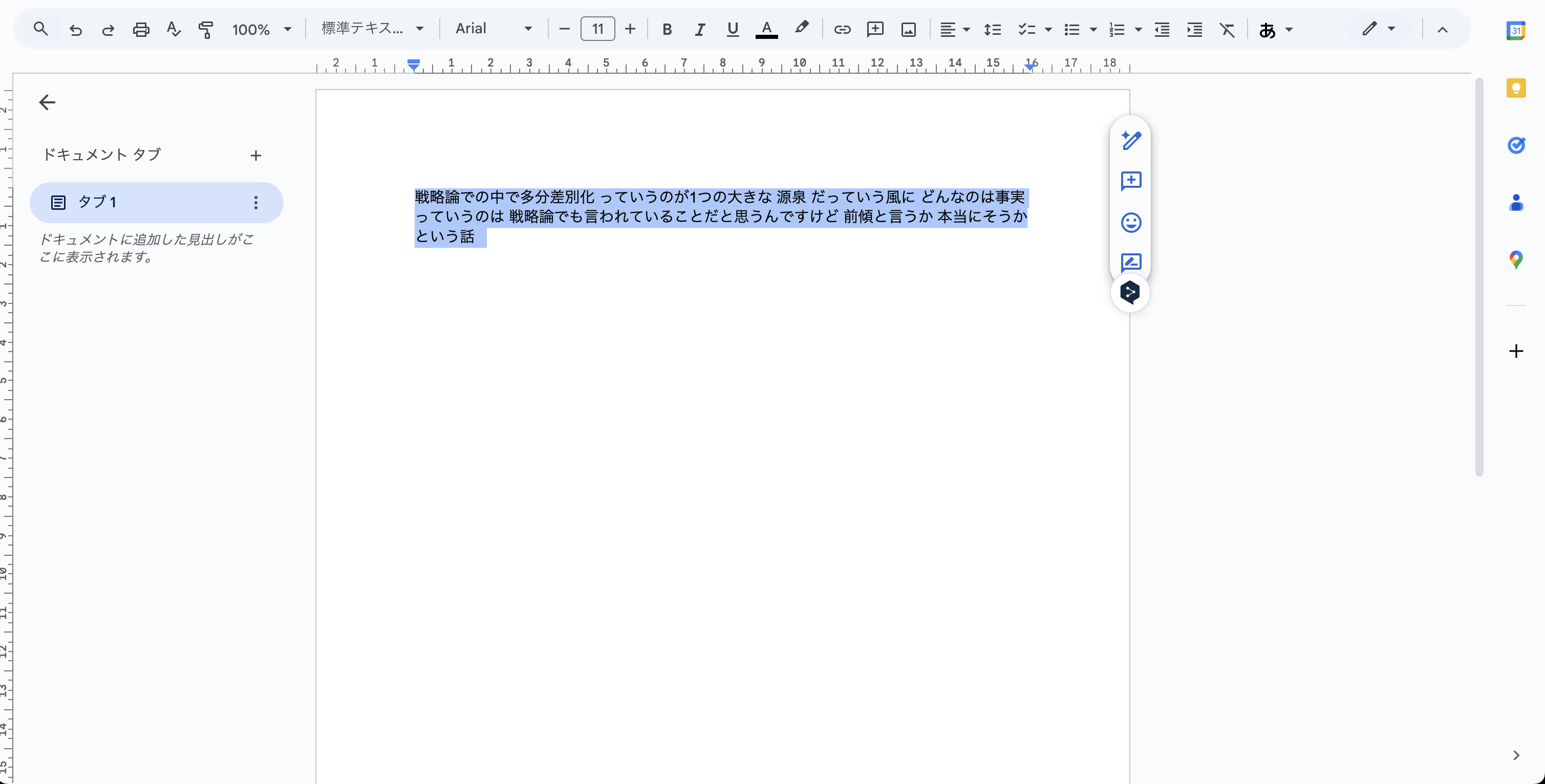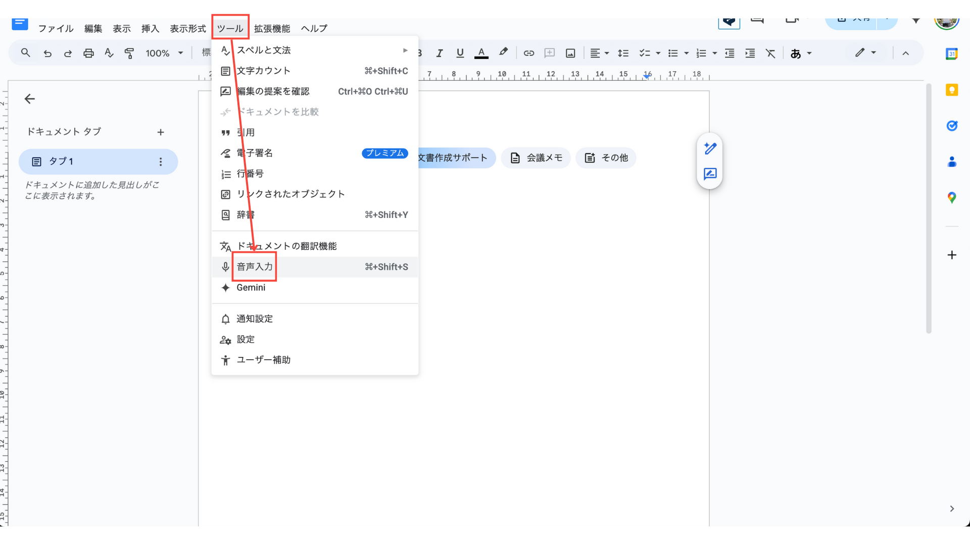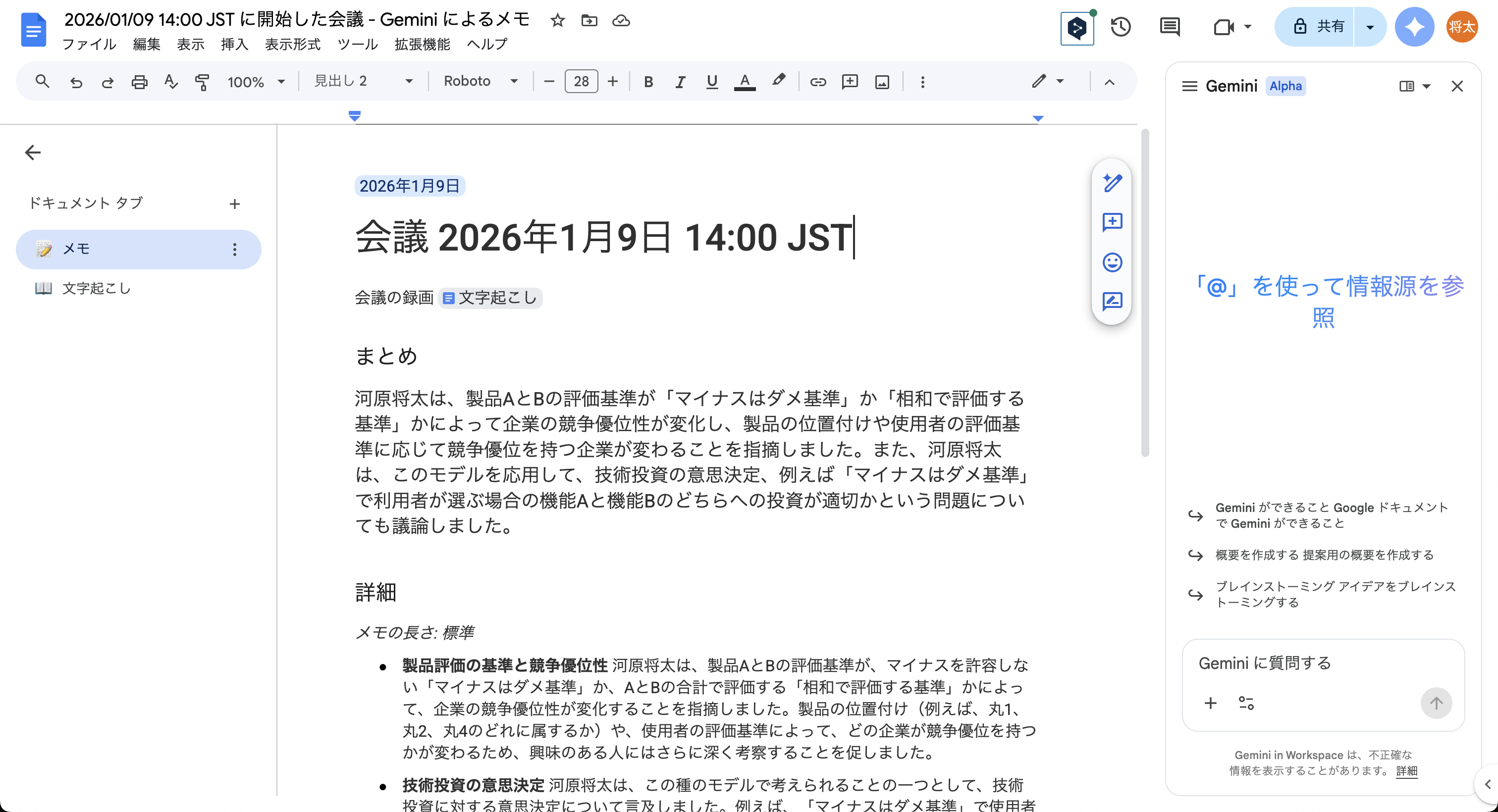 Googleドキュメントには音声入力機能とGeminiが内蔵されているため、他のアプリを開く必要なく、議事録作成を完了させることができます。