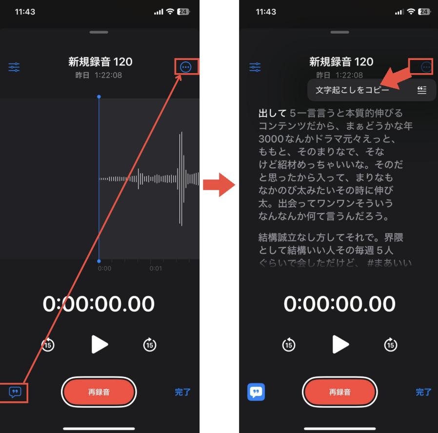 ステップ1:ボイスメモアプリで録音後、「文字起こしをコピー」をクリックする