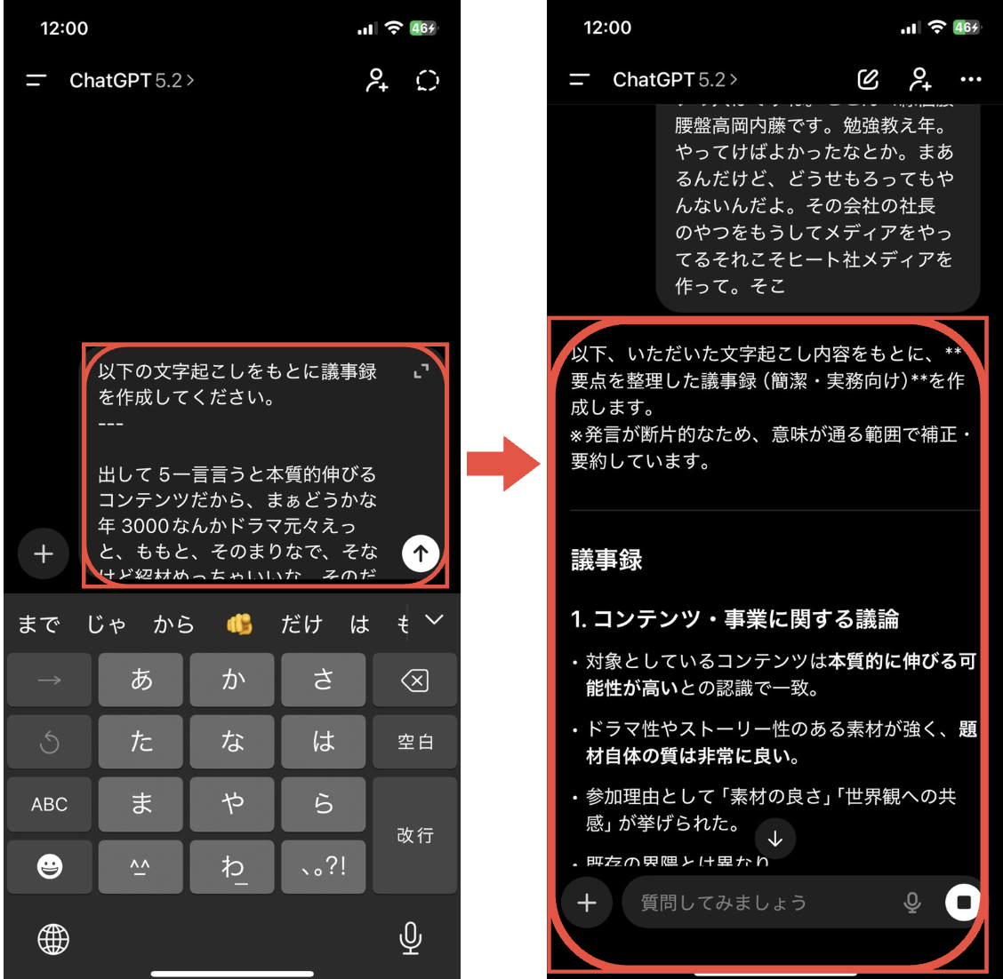 iPhone上のChatGPTアプリを使えば、PCに移す手間もなく、スマホ完結で議事録の素案を作成できるため、移動中の作業にも最適です。