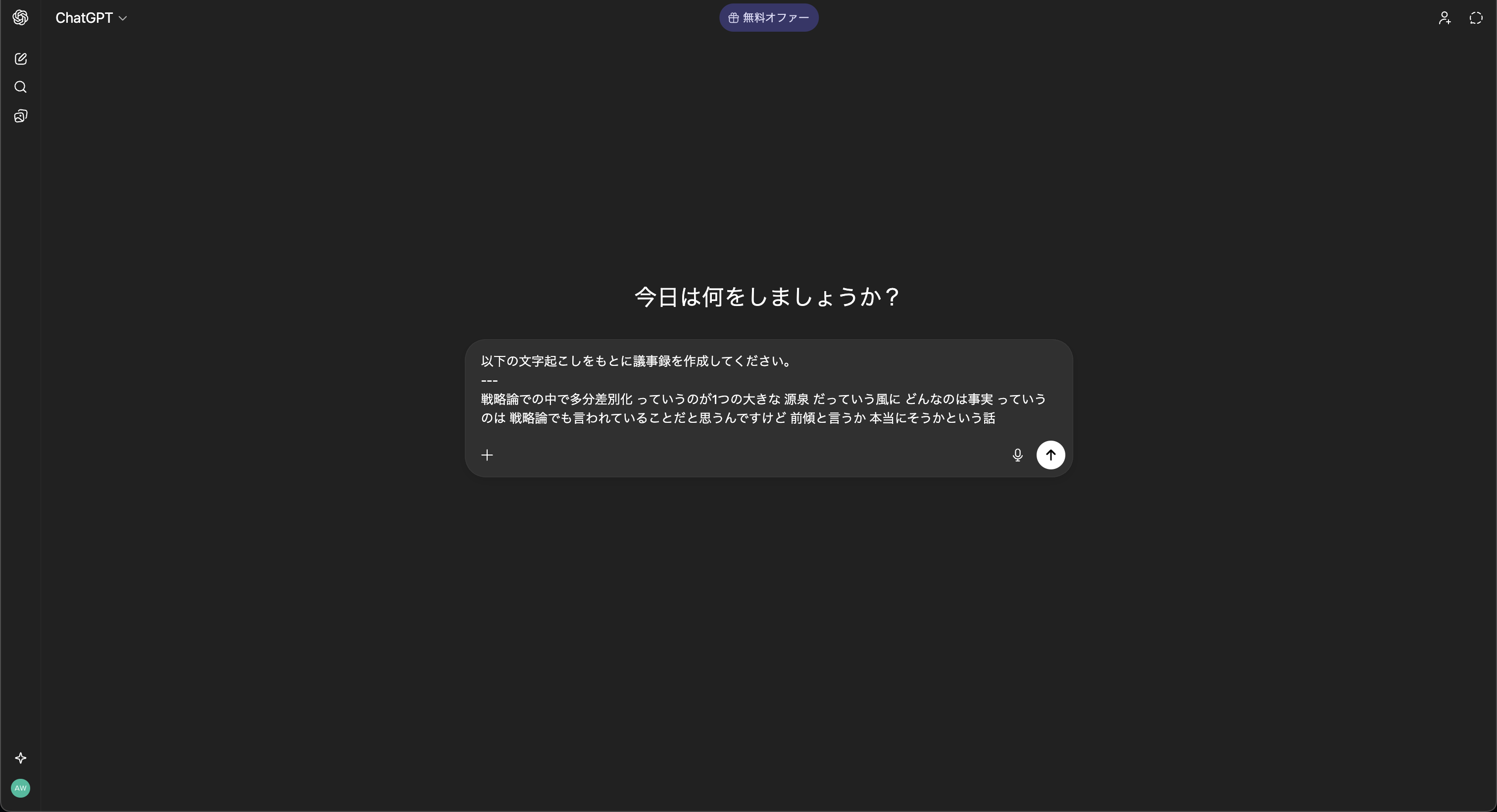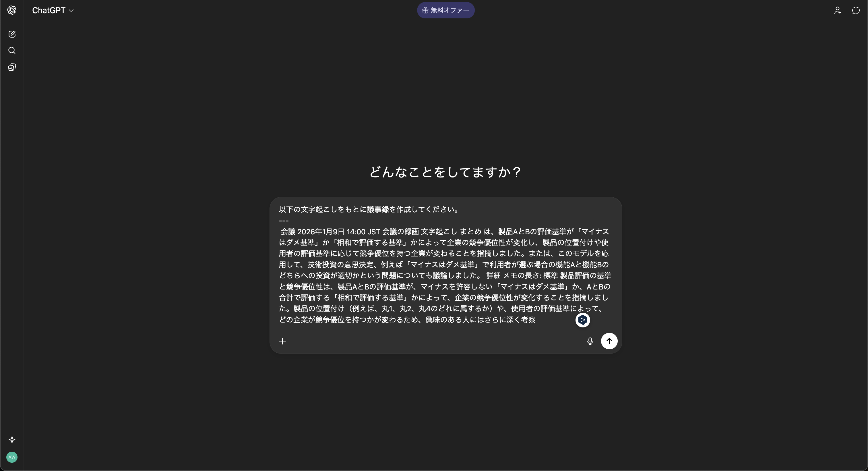 - 指示出し:テキストをChatGPTに渡し「議事録にして」と頼む
