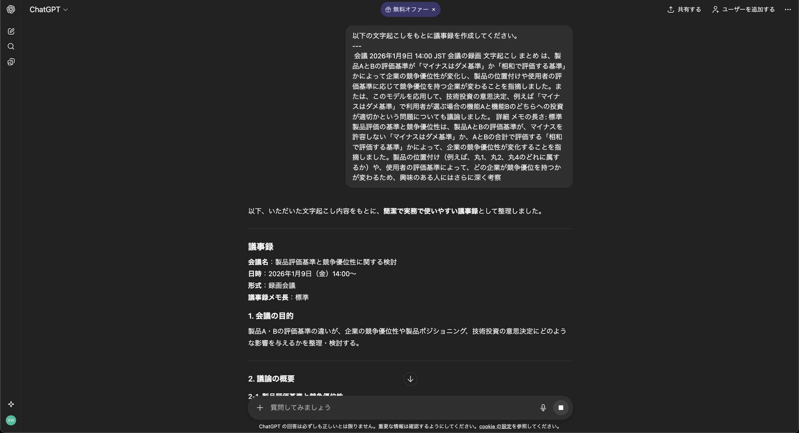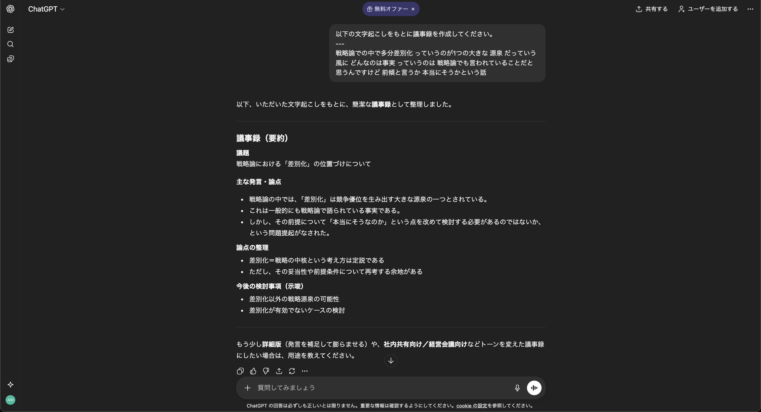 まず、一度に入力できる文字数(トークン数)の上限が有料版より低い場合があり、長い会議だと分割して入力する必要があります。