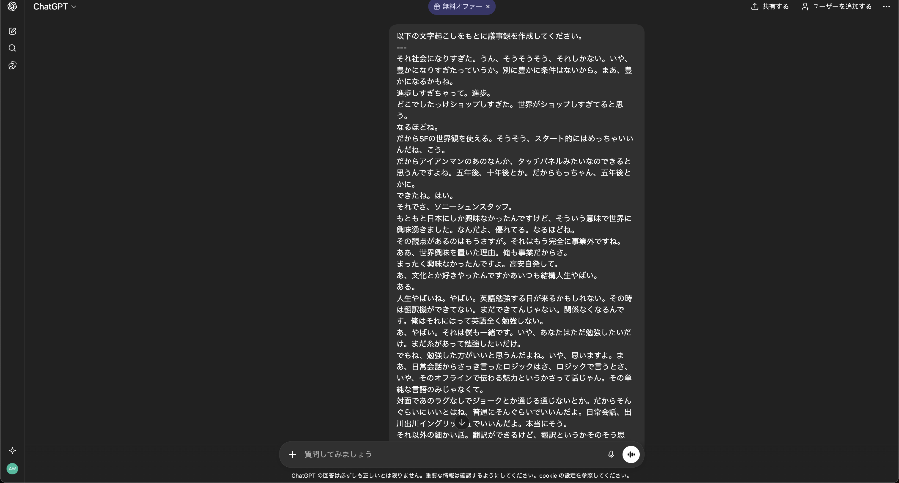 はい、無料版(GPT-4o miniなど)でも議事録の作成は可能です。