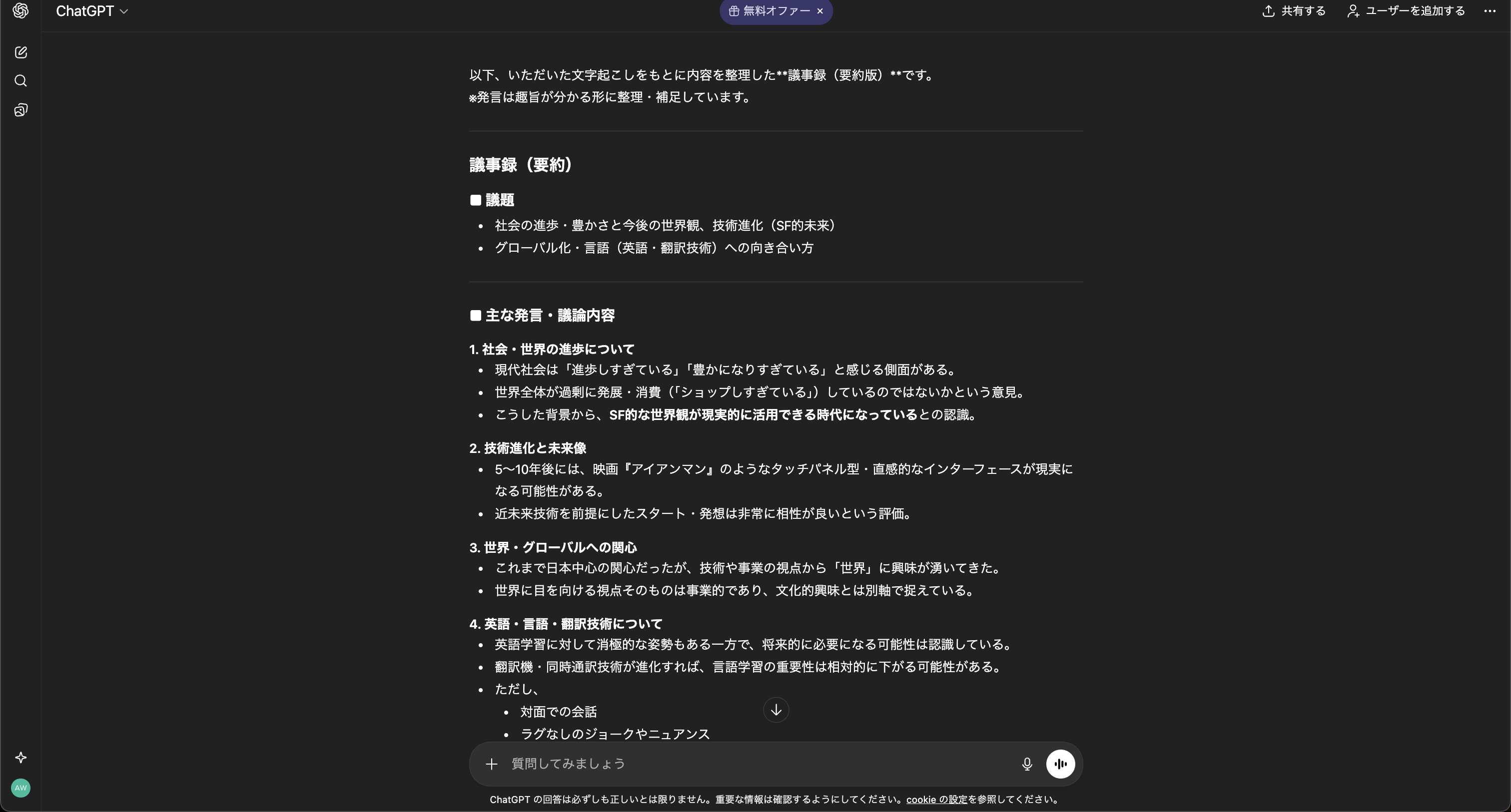 ChatGPTの翻訳能力は従来の翻訳エンジンよりも文脈理解に優れており、多言語が飛び交う会議でも違和感のない自然な日本語議事録を作成できます。