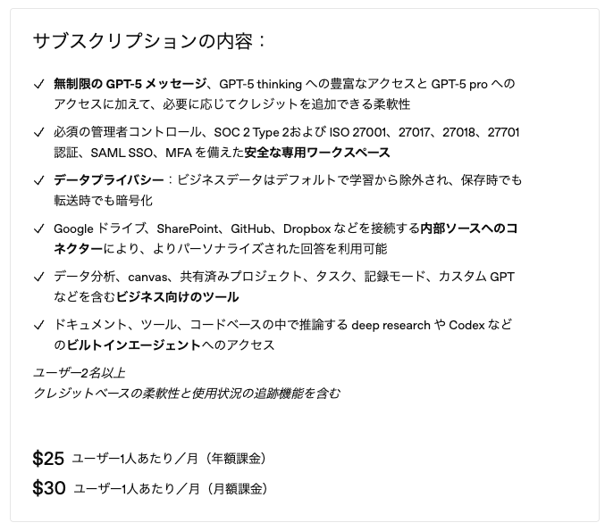また、共有ワークスペースやカスタムGPTsの共有など、チームでの利用を前提とした機能が充実しています。