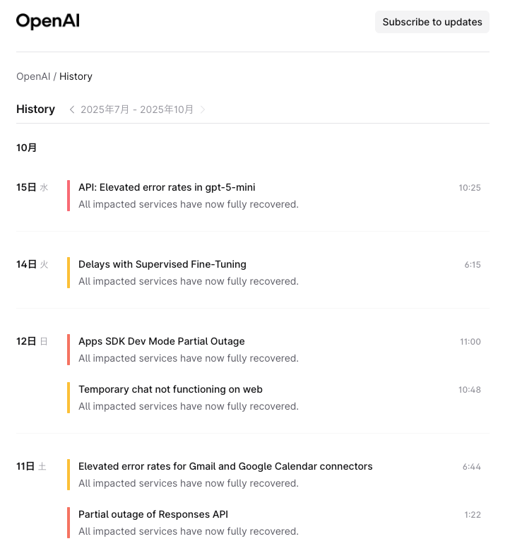 こちらは、ChatGPTのサーバー稼働状況や過去の障害情報を確認できる公式サイトです。合わせてご覧ください。 https://status.openai.com/history