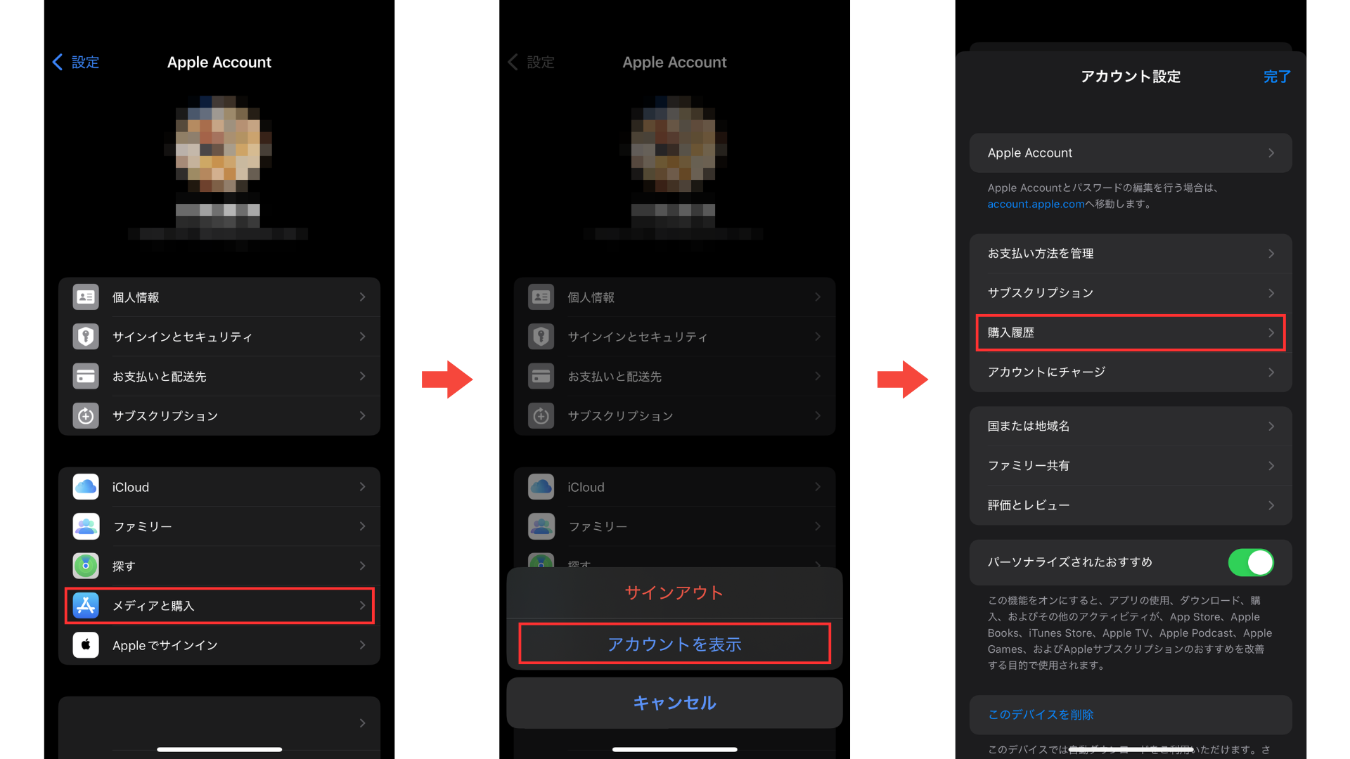 ステップ2:「メディアと購入」>「アカウントを表示」>「購入履歴」の順に進む