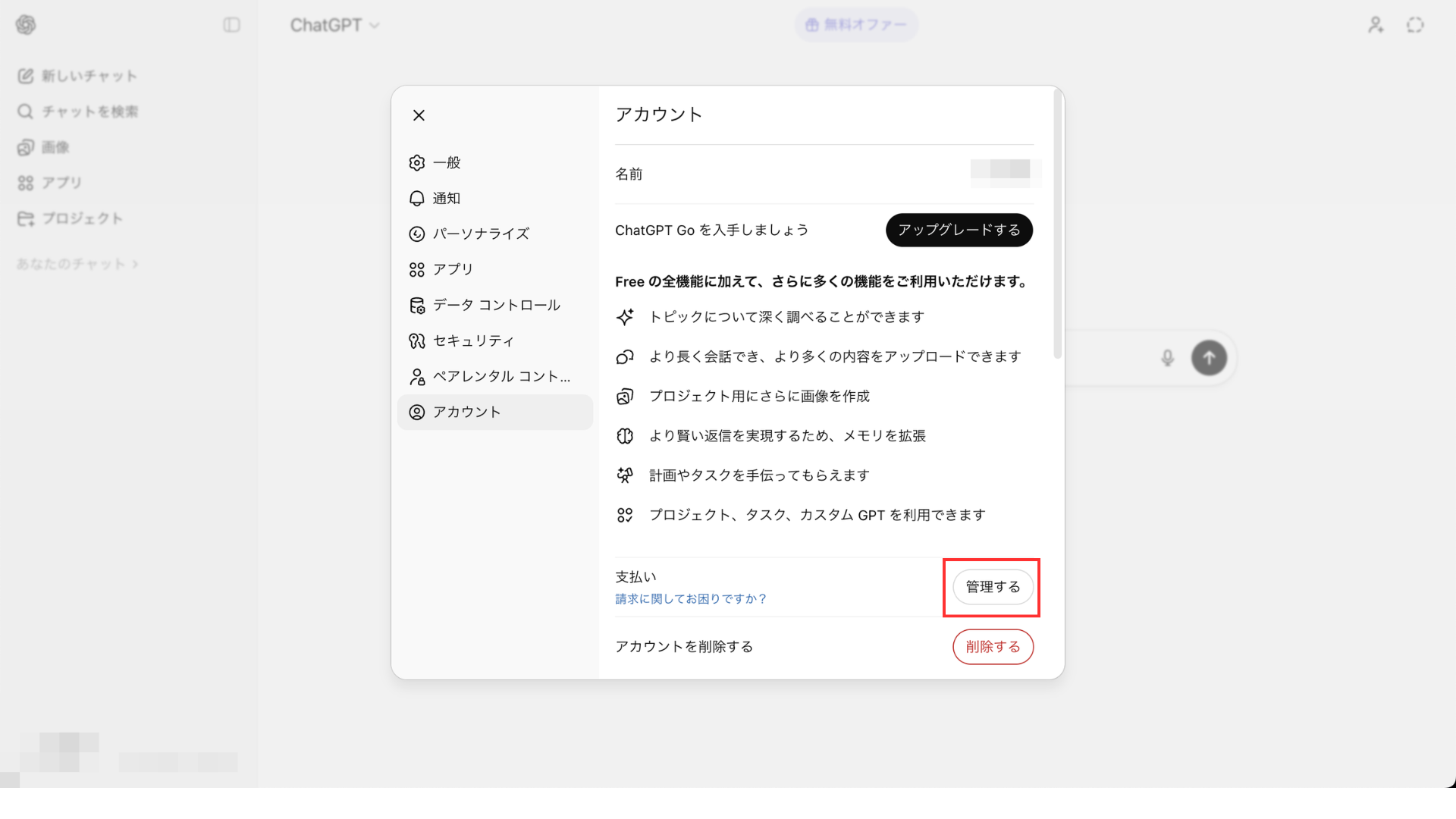 ステップ2:「アカウント」内の支払い欄「管理する」をクリック