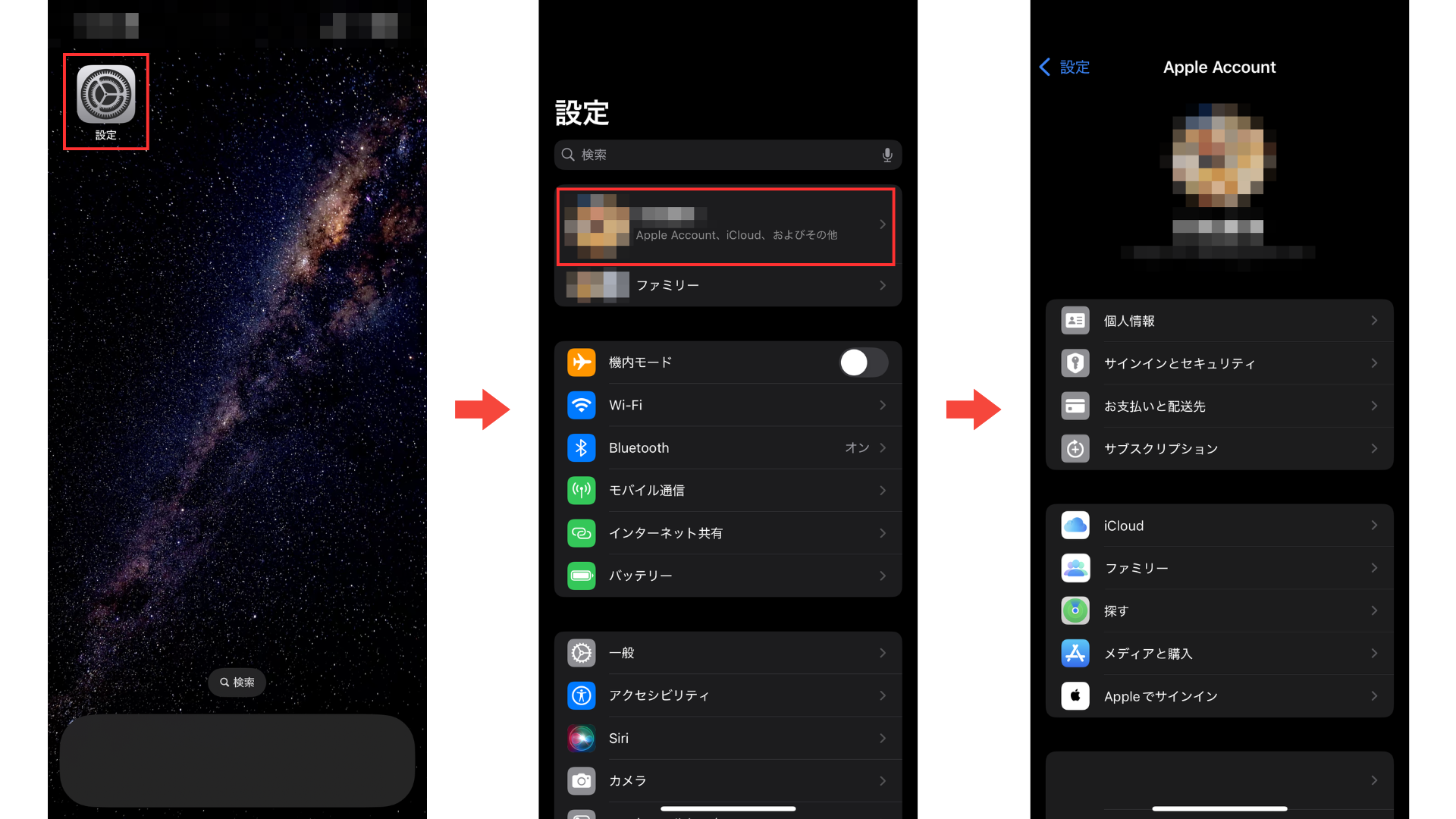 ステップ1:iPhoneの「設定」を開き、最上部の自分の名前(Apple ID)をタップ