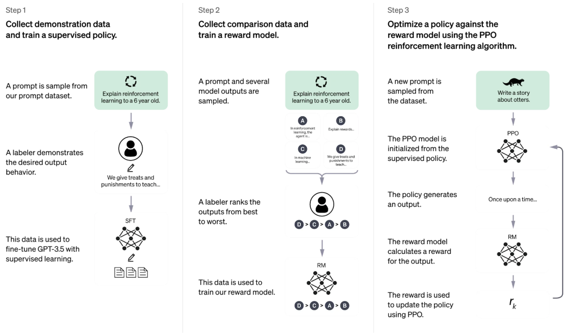 このモデルは、InstructGPT と同じ方法で、人間のフィードバックからの強化学習(RLHF)を使って学習させていますが、データ収集の設定がわずかに異なります。私たちは、教師ありファインチューニングを使用して初期モデルを学習させてきました。人間の AI トレーナーが、ユーザーと AI アシスタントの両方の立場で会話をしました。トレーナーがモデル文書の提案にアクセスできるようにし、回答の作成に役立つようにしました。この新しい対話データセットを InstructGPT データセットと組み合わせ、対話形式に変換しました。