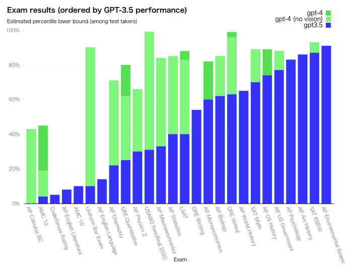 OpenAI におけるディープラーニングのスケール拡大の取り組みにおいて、最新のマイルストーンとなるのが GPT‑4 です。画像とテキストの両方を入力として受け取り、テキストを出力する大規模なマルチモーダルモデルです。現実世界の多くの場面では人間に及ばないものの、専門的・学術的なさまざまなベンチマークで人間並みのパフォーマンスを発揮します。たとえば GPT‑4 は、模擬司法試験で合格圏に入り、受験者の上位 10% 程度のスコアを記録しました。これは、下位 10% 程度だった GPT‑3.5 との大きな違いです。当社では、敵対的テストプログラムや ChatGPT で得た知見を活用し、6 か月間にわたって GPT‑4 を調整しました。完全ではないものの、正確性や操作性、制限の順守において過去最高の成果を達成しました。